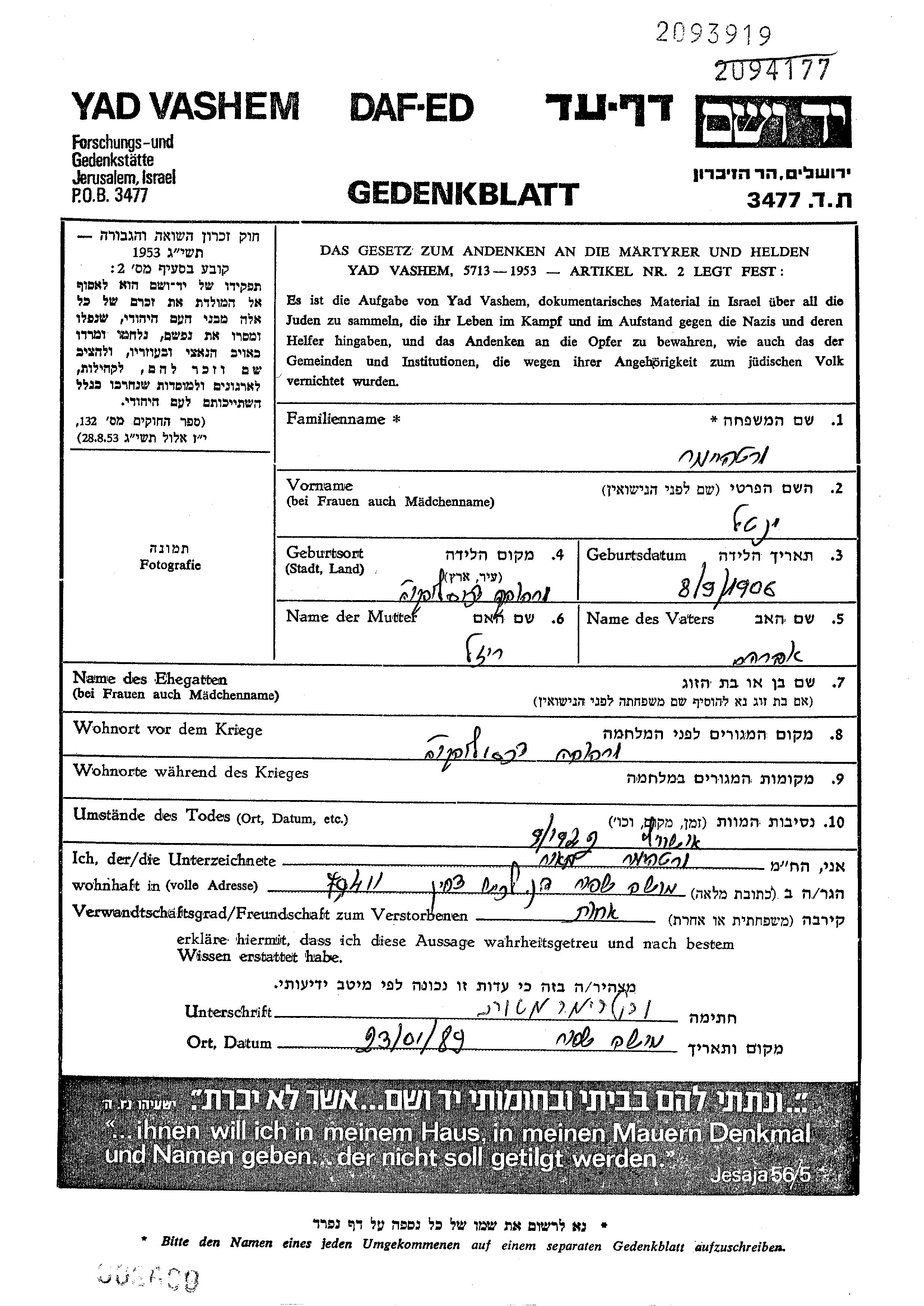 Wertheimer Yentl 1906 Vrbove, Tschechoslowakei Gedenkblatt