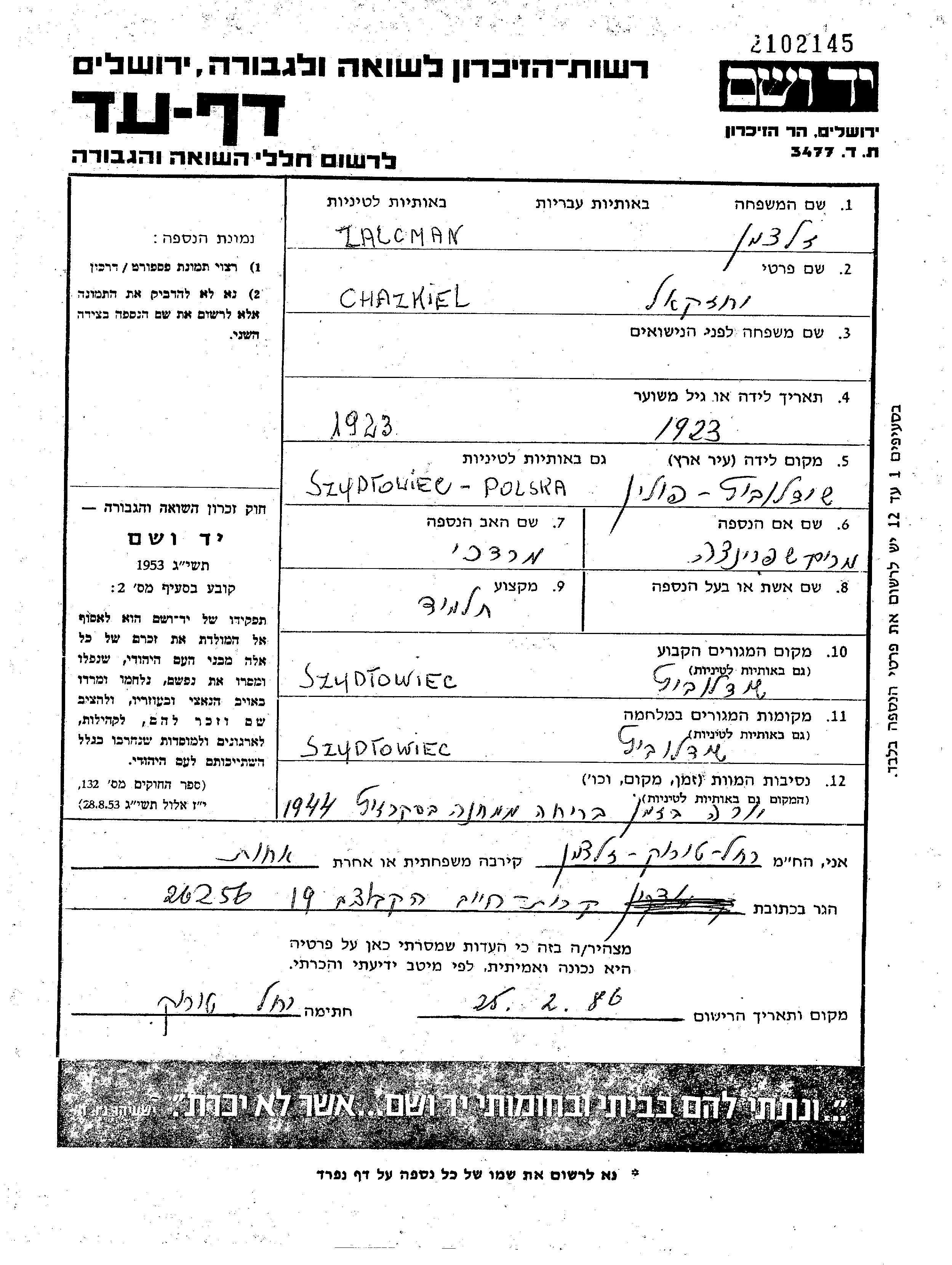 Chazkiel Zalcman wurde im Jahr 1923 in Szydlowiec, Polen geboren. Er war der Sohn von Mordechai und Szprinca Miriam. Er war Schüler/-in. Vor dem Zweiten Weltkrieg lebte er in Szydlowiec, Polen. Während des Krieges war er in Szydlowiec, Polen.