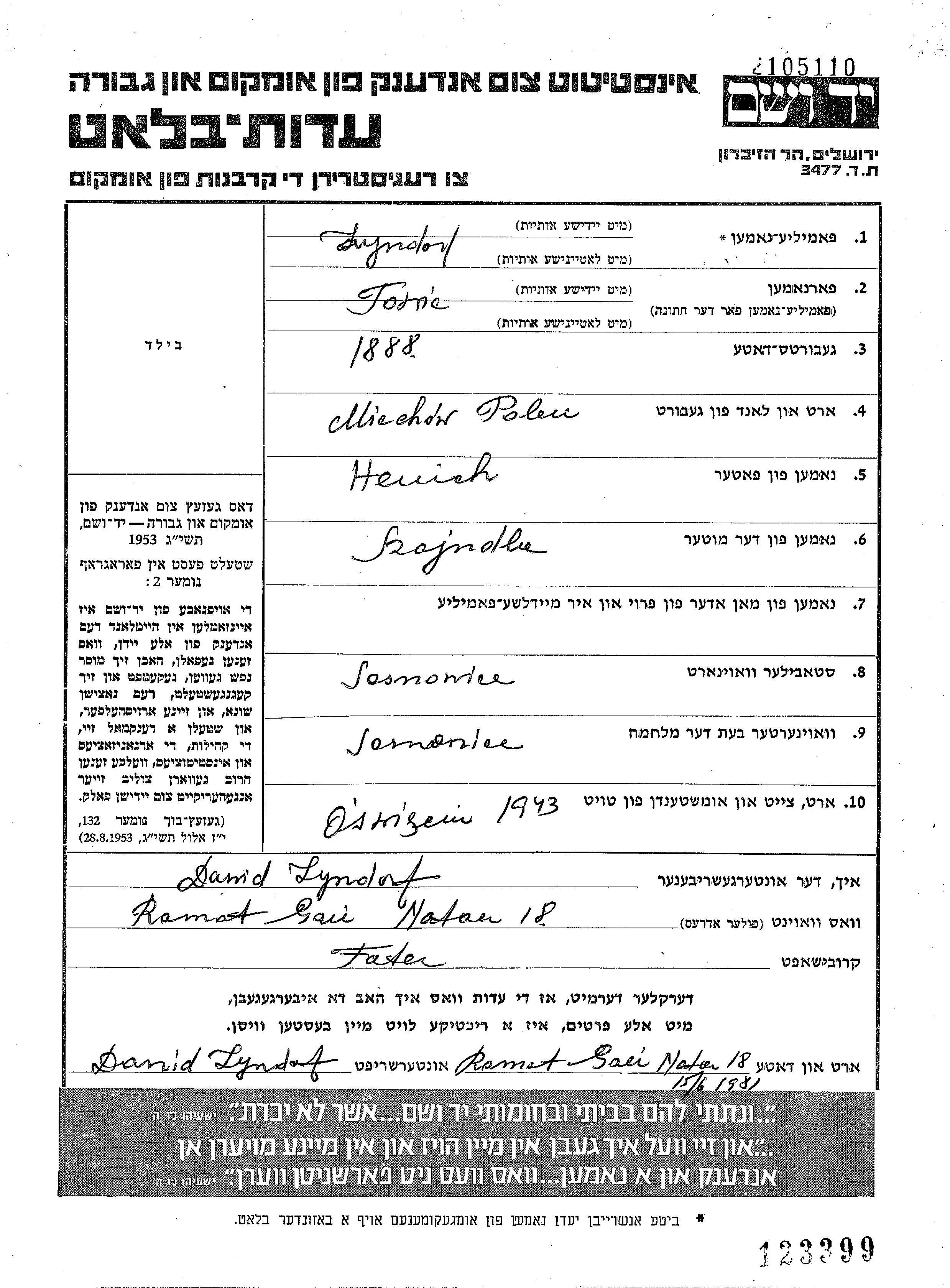 Towie Zyndorf wurde im Jahr 1888 in Miechow, Polen geboren. Er war der Sohn von Heinich und Szajndla. Er war mit Hadasa Verheiratet. Vor dem Zweiten Weltkrieg lebte er in Sosnowiec, Polen. Während des Krieges war er in Sosnowiec, Polen.