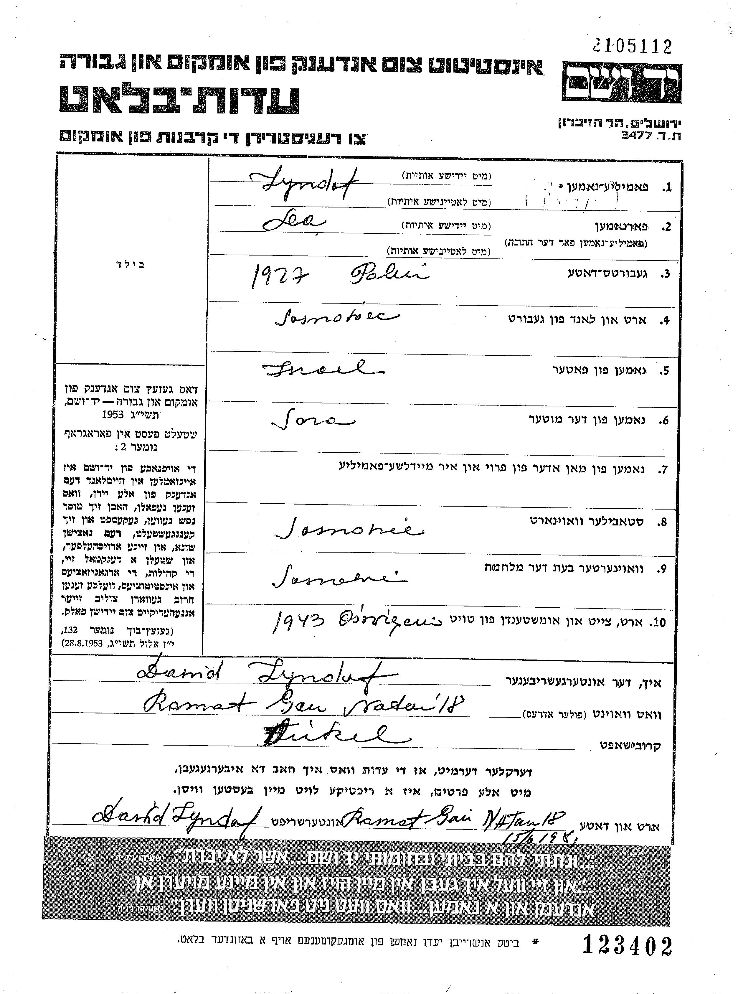 Lea Zyndorf wurde im Jahr 1927 in Sosnowiec, Polen geboren. Sie war die Tochter von Israel und Sara. Sie war Kind. Vor dem Zweiten Weltkrieg lebte sie in Sosnowiec, Polen. Während des Krieges war sie in Sosnowiec, Polen.