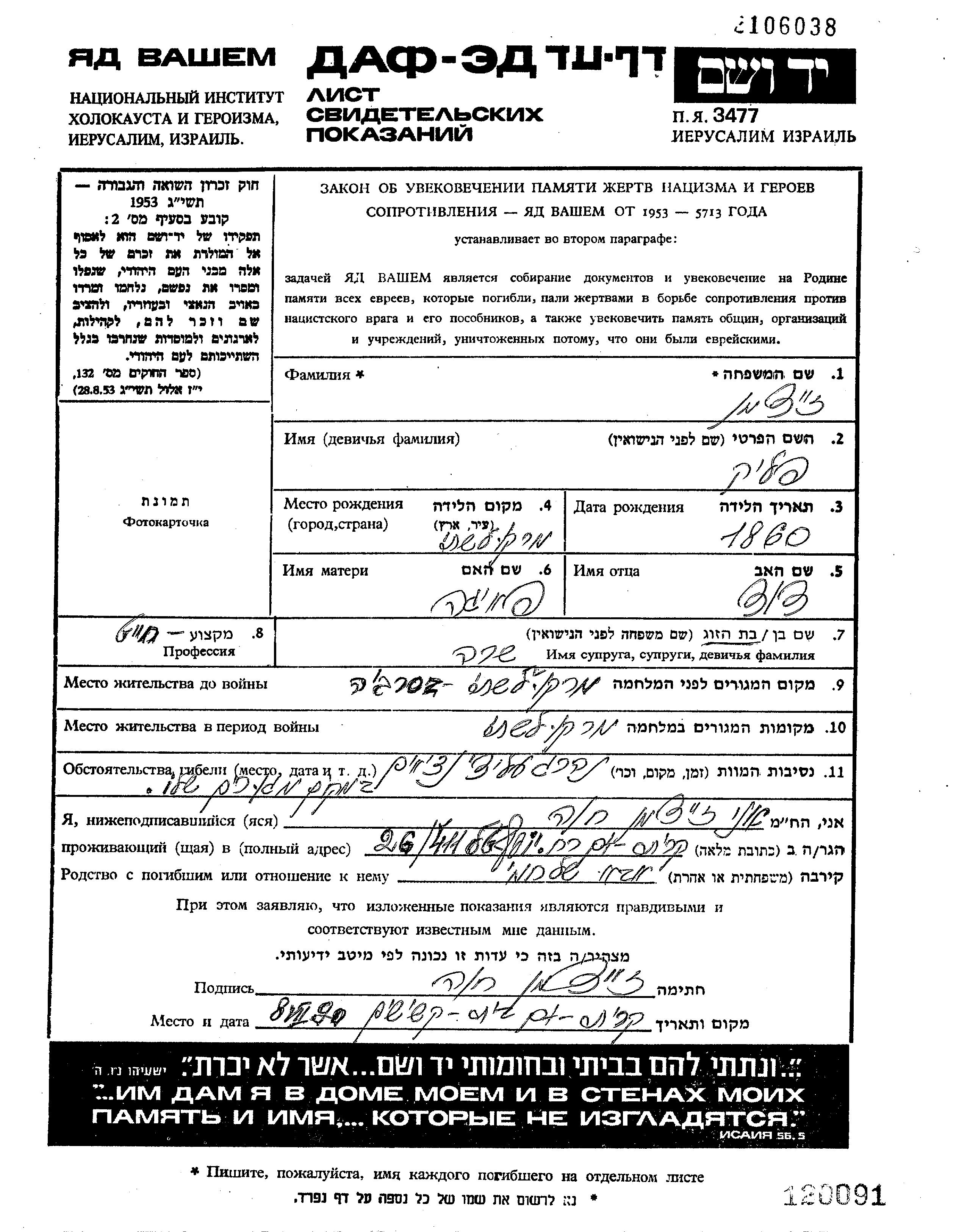 Falik Zeidman wurde im Jahr 1860 in Marculesti, Rumänien geboren. Er war der Sohn von David und Faiga. Er war Schneider und mit Sara Verheiratet. Vor dem Zweiten Weltkrieg lebte er in Marculesti, Rumänien. Während des Krieges war er in Marculesti, Rumänien.