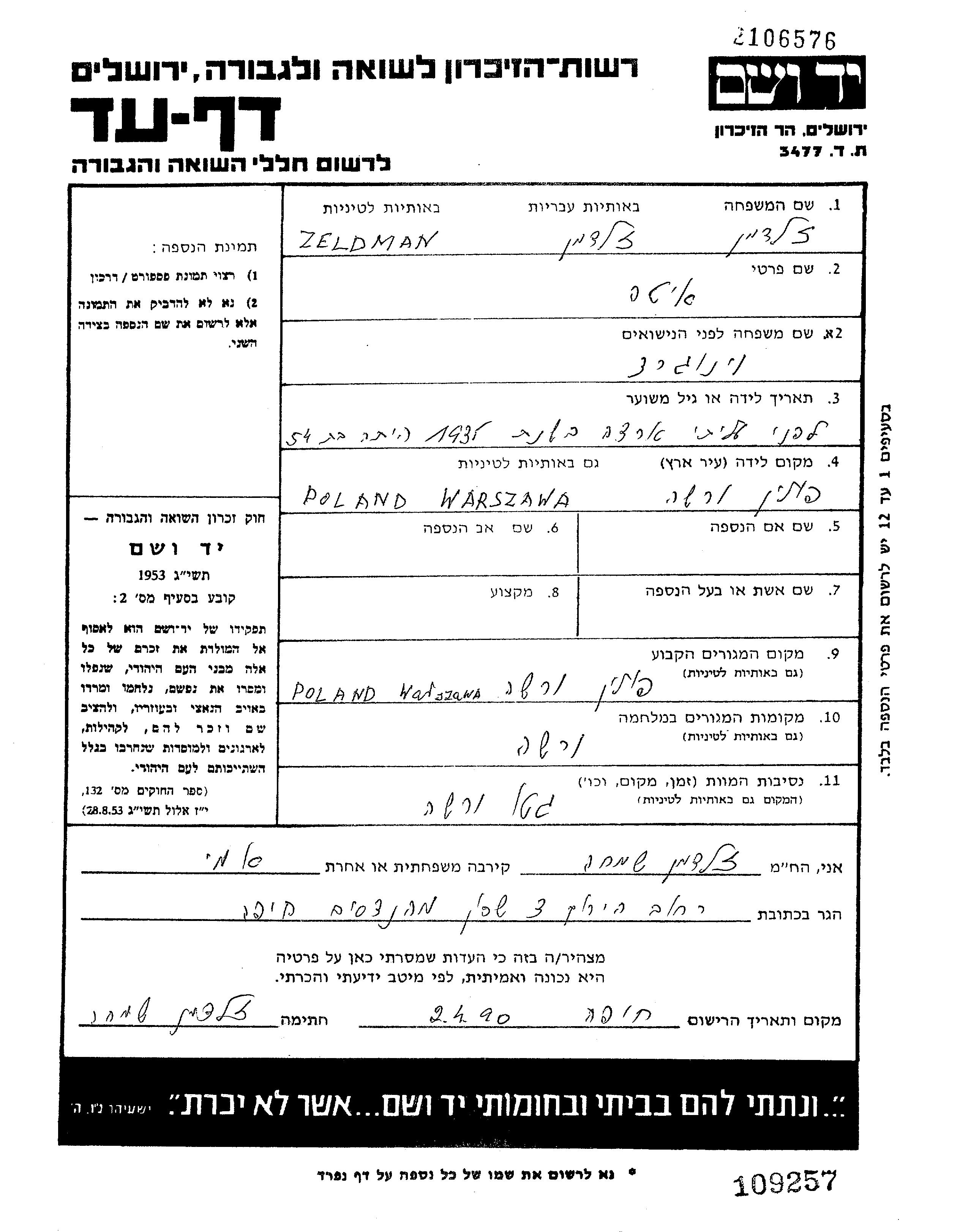Ita Zeldman Zaldman, geb. Vinograd wurde im Jahr 1881 in Warszawa, Polen geboren. Sie war Verheiratet. Vor dem Zweiten Weltkrieg lebte sie in Warszawa, Polen. Während des Krieges war sie in Warszawa, Polen.