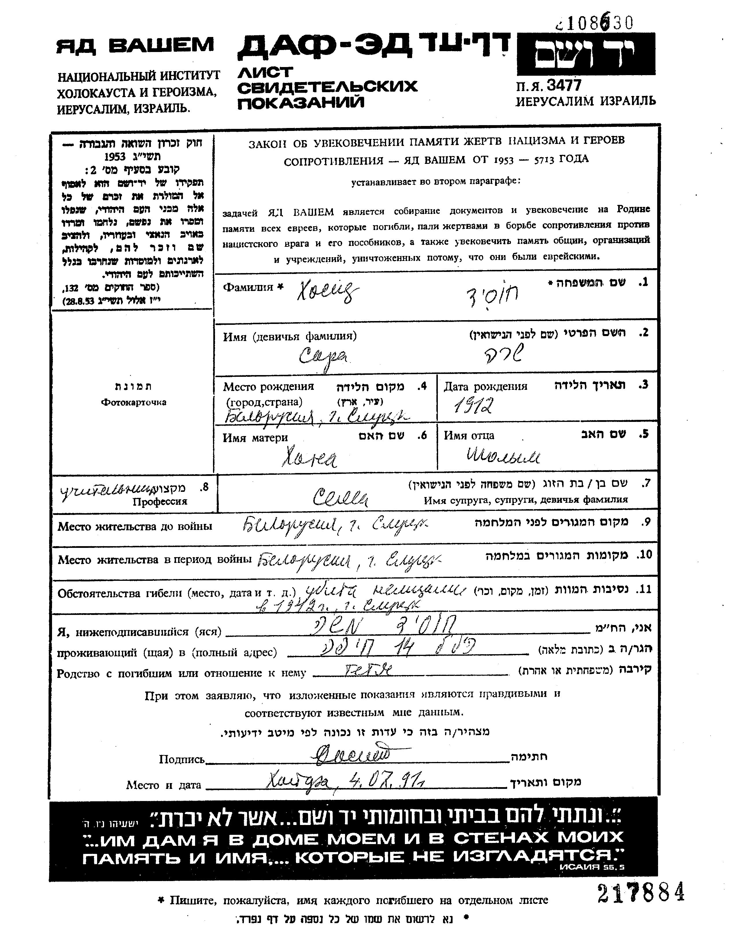Khosid Sara 1912 Slutsk, Weißrussland (UdSSR) Gedenkblatt