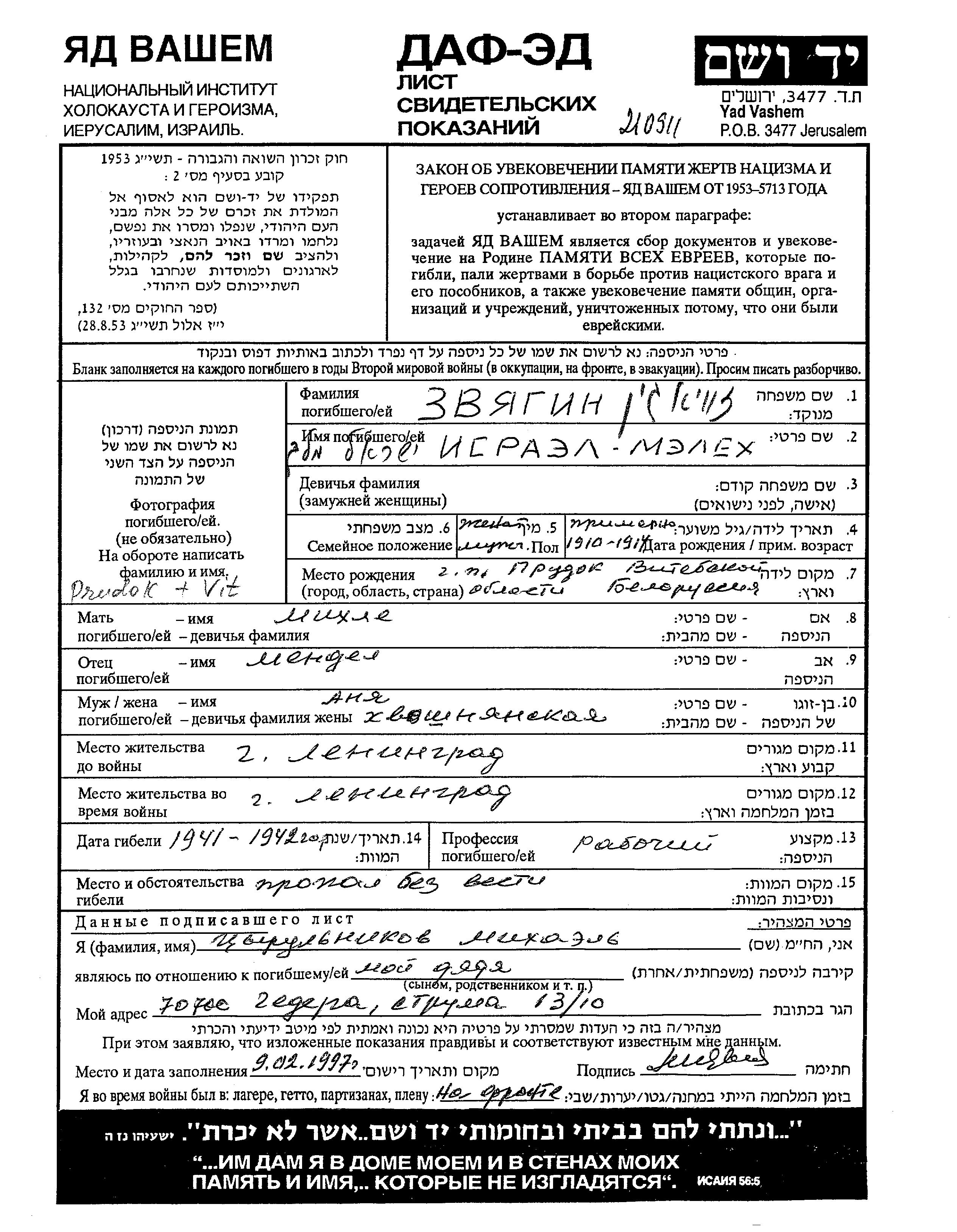Israel Melekh Zvyagin wurde im Jahr 1912 in Prudok, Weißrussland (UdSSR) geboren. Er war der Sohn von Mendel und Mikhle. Er war Arbeiter/-in und mit Anya Verheiratet. Vor dem Zweiten Weltkrieg lebte er in Leningrad, Russland (UdSSR). Während des Krieges war er in Leningrad, Russland (UdSSR).