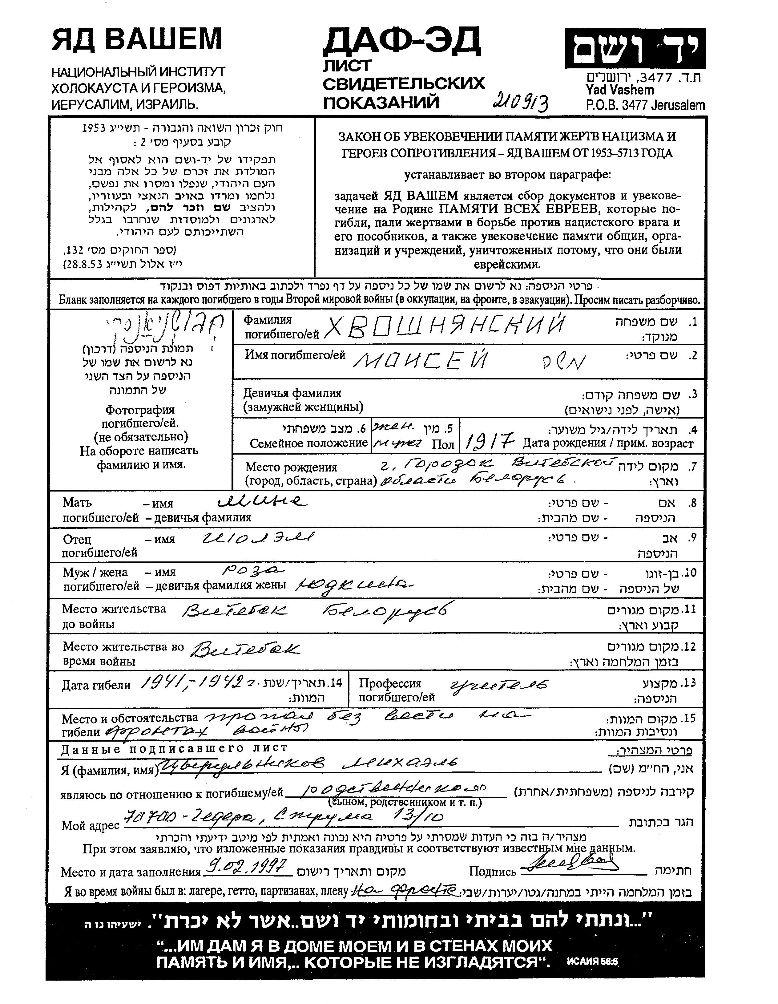Moisei Khvoshnyanski wurde im Jahr 1917 in Gorodok, Weißrussland (UdSSR) geboren. Er war der Sohn von Shalom und Mine. Er war Lehrer/in und mit Roza Verheiratet. Vor dem Zweiten Weltkrieg lebte er in Vitebsk, Weißrussland (UdSSR). Während des Krieges war er in die Sowjetischen Streitkräfte.