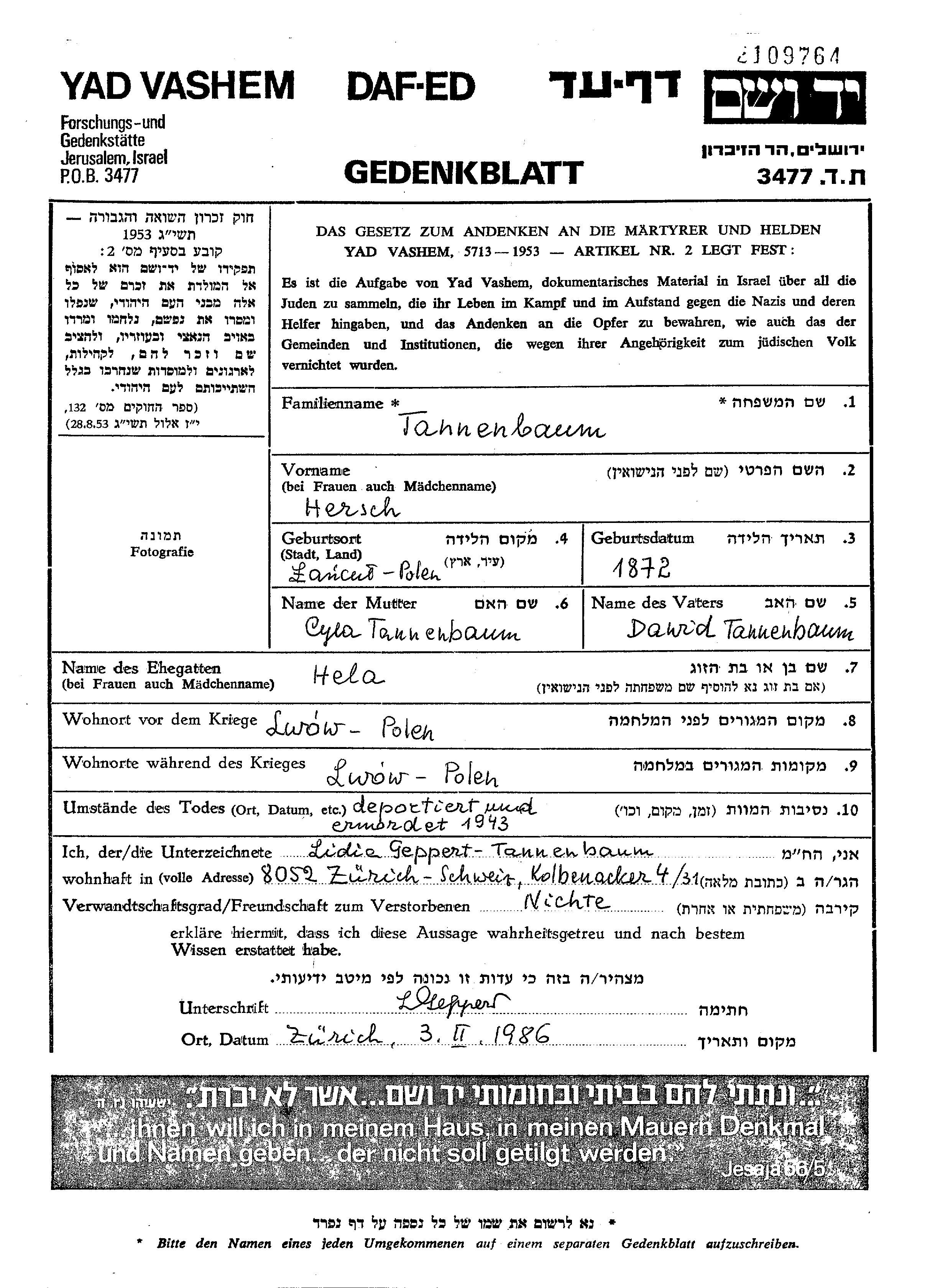 Hersch Tannenbaum wurde im Jahr 1872 in Lancut, Polen geboren. Er war der Sohn von Dawid und Cyla. Er war mit Hela Verheiratet. Vor dem Zweiten Weltkrieg lebte er in Lwow, Polen. Während des Krieges war er in Lwow, Polen.