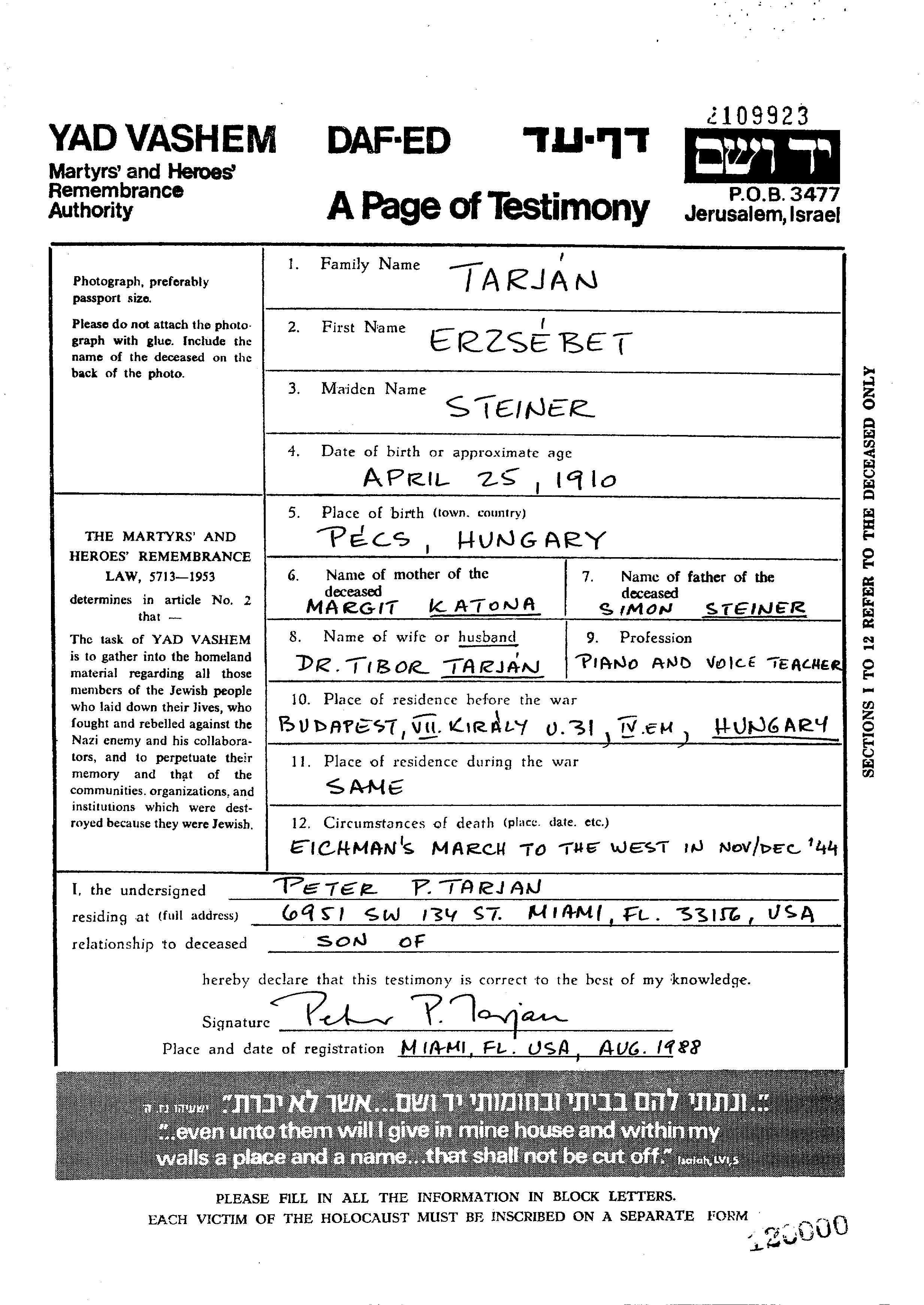 Erzsebet Tarjan, geb. Steiner wurde im Jahr 1910 in Pecs, Ungarn geboren. Sie war die Tochter von Simon und Margit, geb. Katona. Sie war mit Tibor Verheiratet. Vor dem Zweiten Weltkrieg lebte sie in Budapest, Ungarn. Während des Krieges war sie in Budapest, Ungarn.