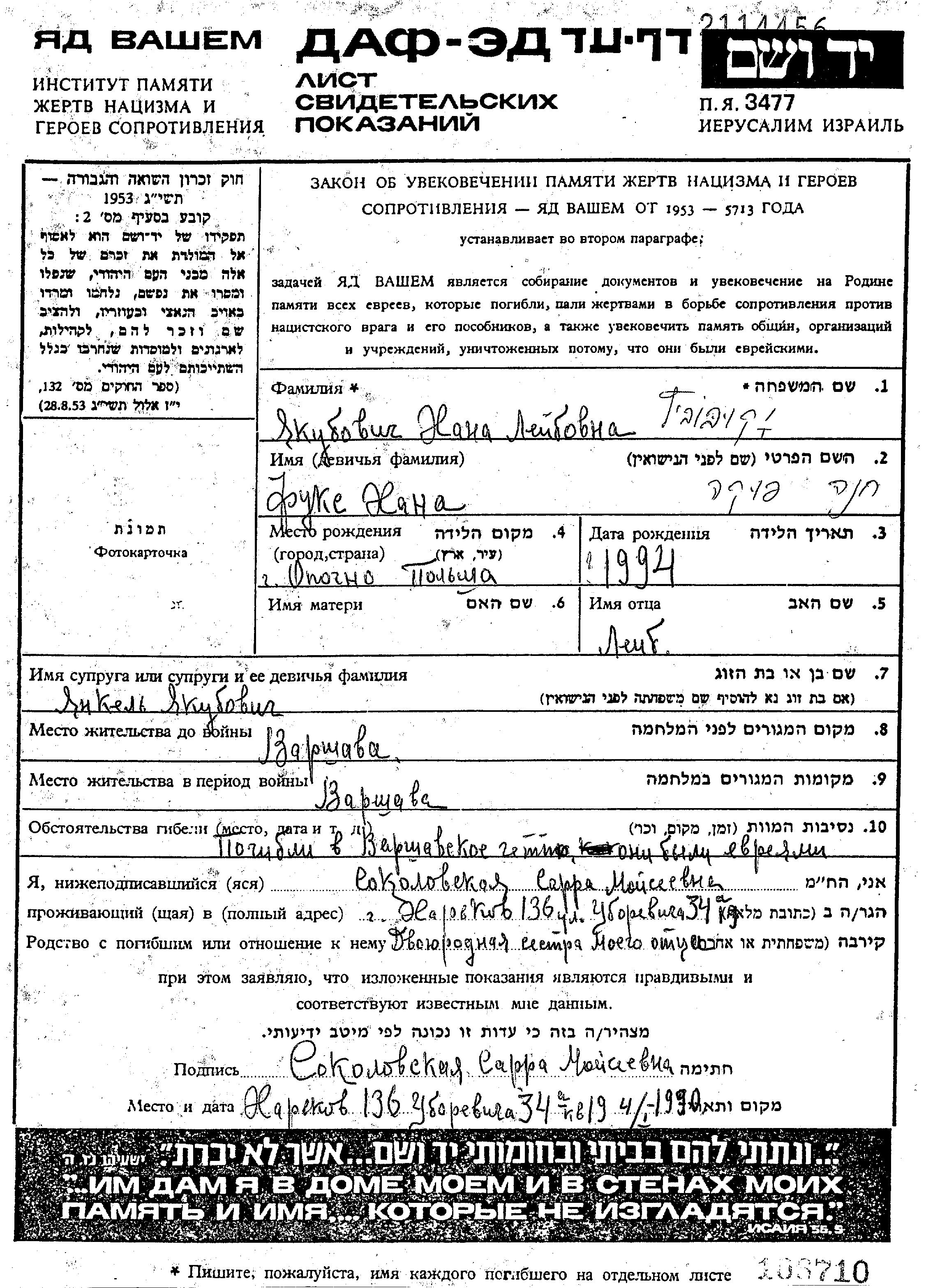 Khana Yakubovich, geb. Fuks wurde in Opoczno, Polen geboren. Sie war die Tochter von Leib. Sie war mit Yankel Verheiratet. Vor dem Zweiten Weltkrieg lebte sie in Warszawa, Polen. Während des Krieges war sie in Warszawa, Polen.