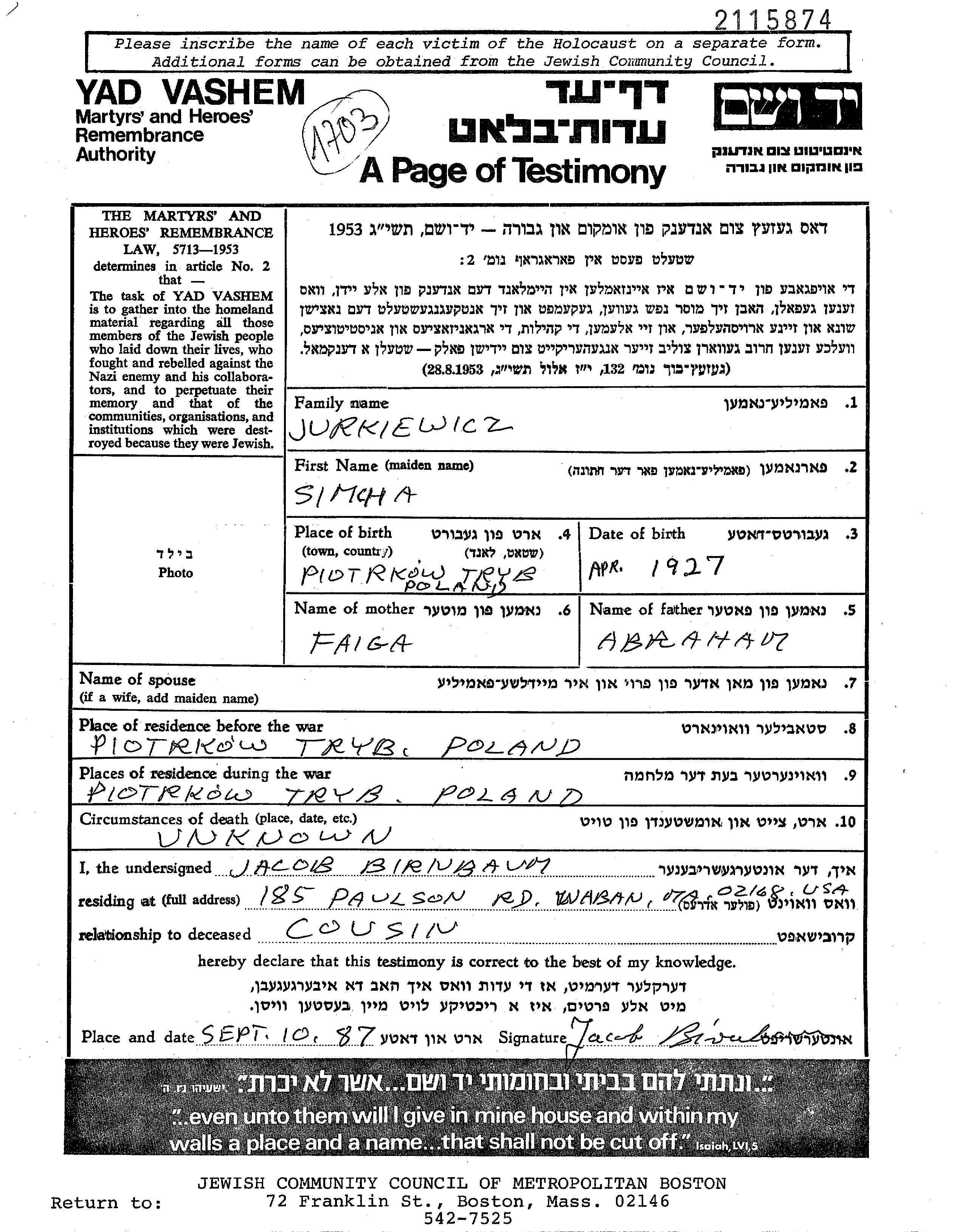 Simcha Jurkiewicz wurde im Jahr 1927 in Piotrkow Trybunalski, Polen geboren. Er war der Sohn von Abraham und Faiga, geb. Jurkiewicz. Er war Kind. Vor dem Zweiten Weltkrieg lebte er in Piotrkow Trybunalski, Polen. Während des Krieges war er in Piotrkow Trybunalski, Polen.