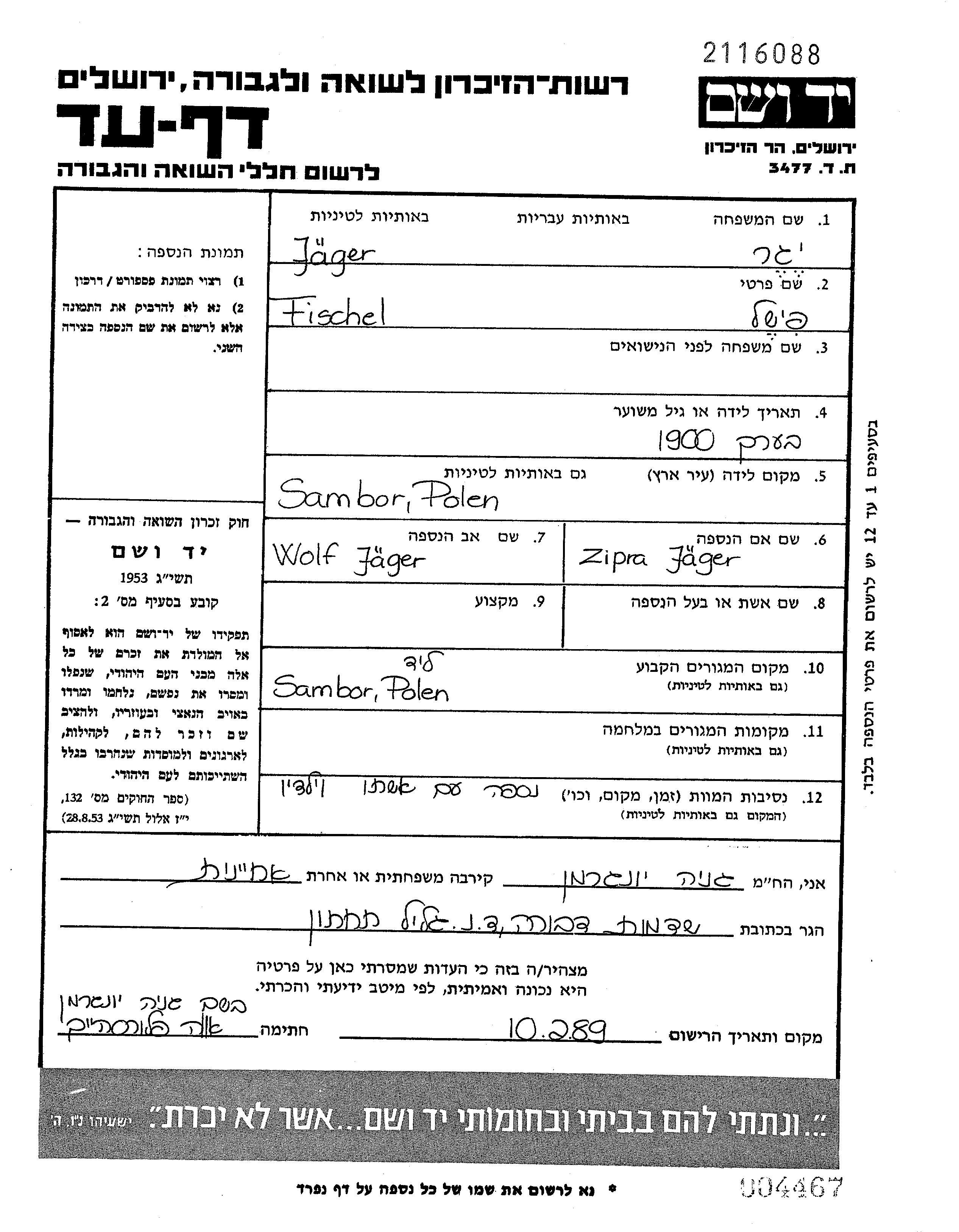 Fischel Jäger wurde im Jahr 1900 in Sambor, Polen geboren. Er war der Sohn von Wolf und Zipra. Er war Verheiratet. Vor dem Zweiten Weltkrieg lebte er in Sambor, Polen. Während des Krieges war er in Sambor, Polen.
