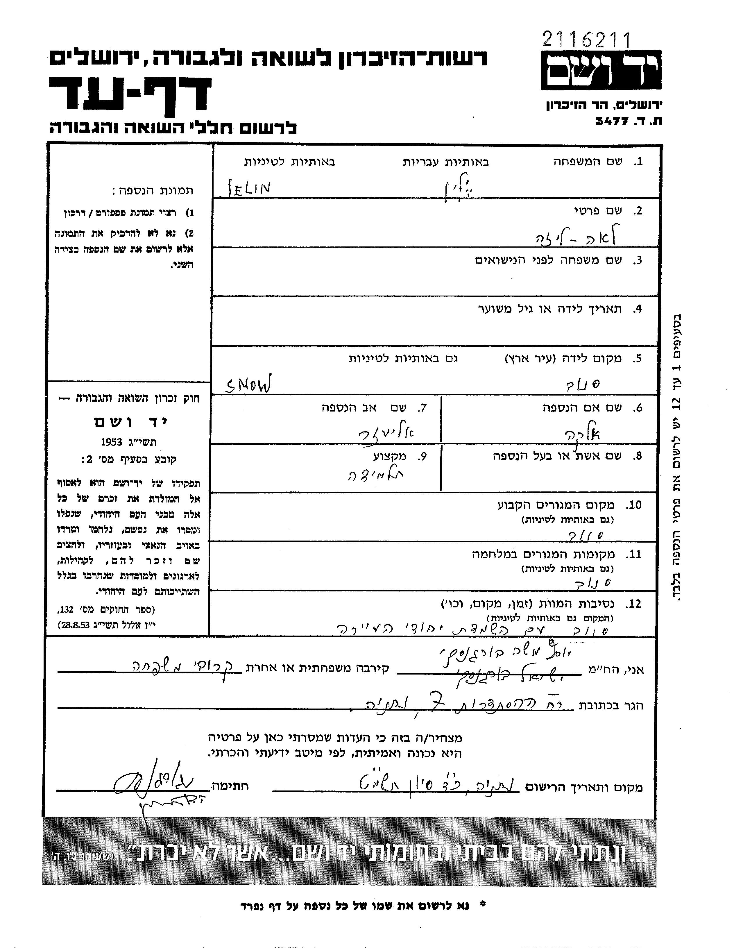 Liza Lea Jelin wurde in Snow, Polen geboren. Sie war die Tochter von Eliezer und Elka. Sie war Schüler/-in und Kind. Vor dem Zweiten Weltkrieg lebte sie in Snow, Polen. Während des Krieges war sie in Snow, Polen.
