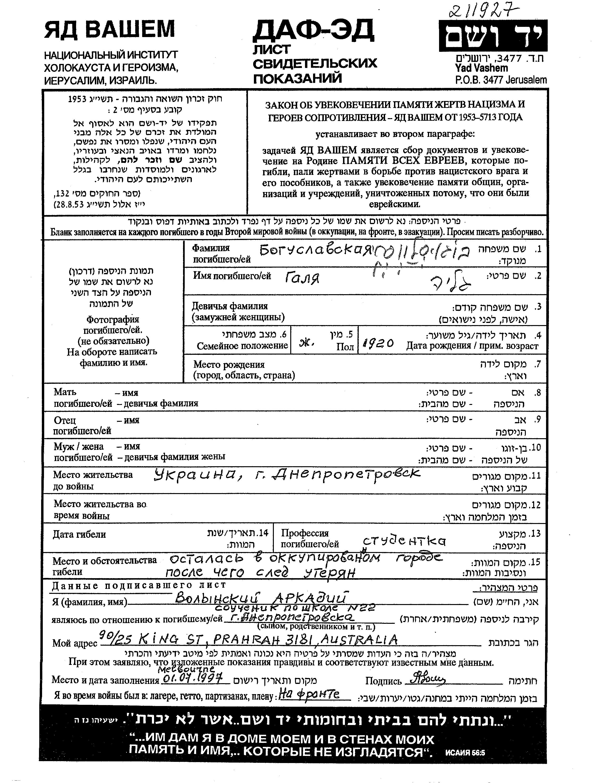 Galia Boguslavski wurde im Jahr 1920 geboren. Sie war Student. Vor dem Zweiten Weltkrieg lebte sie in Dnepropetrovsk, Ukraine (UdSSR). Während des Krieges war sie in Dnepropetrovsk, Ukraine (UdSSR).