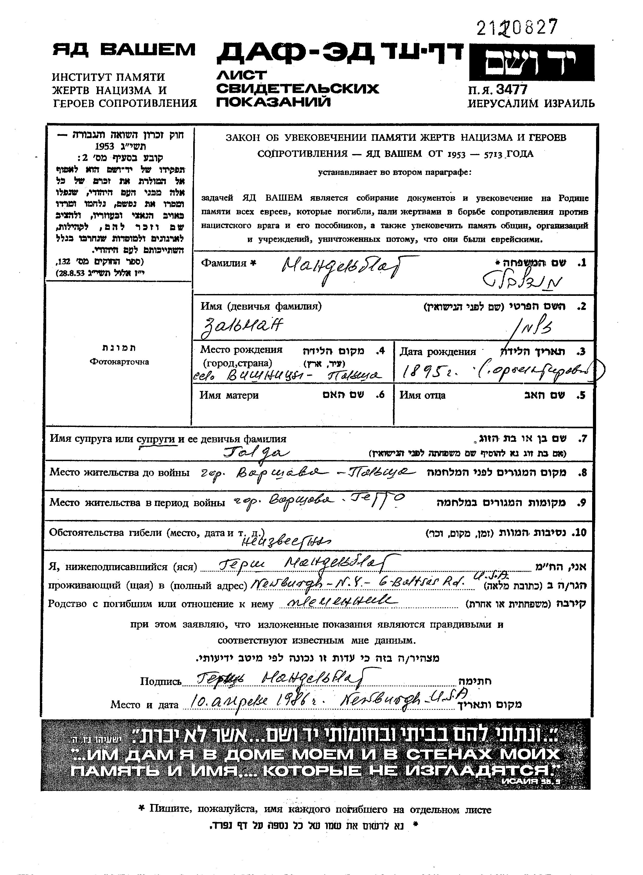 Zalman Mandelblat wurde im Jahr 1895 in Wisznice, Polen geboren. Er war mit Golda Verheiratet. Vor dem Zweiten Weltkrieg lebte er in Warszawa, Polen. Während des Krieges war er in Warszawa, Polen.