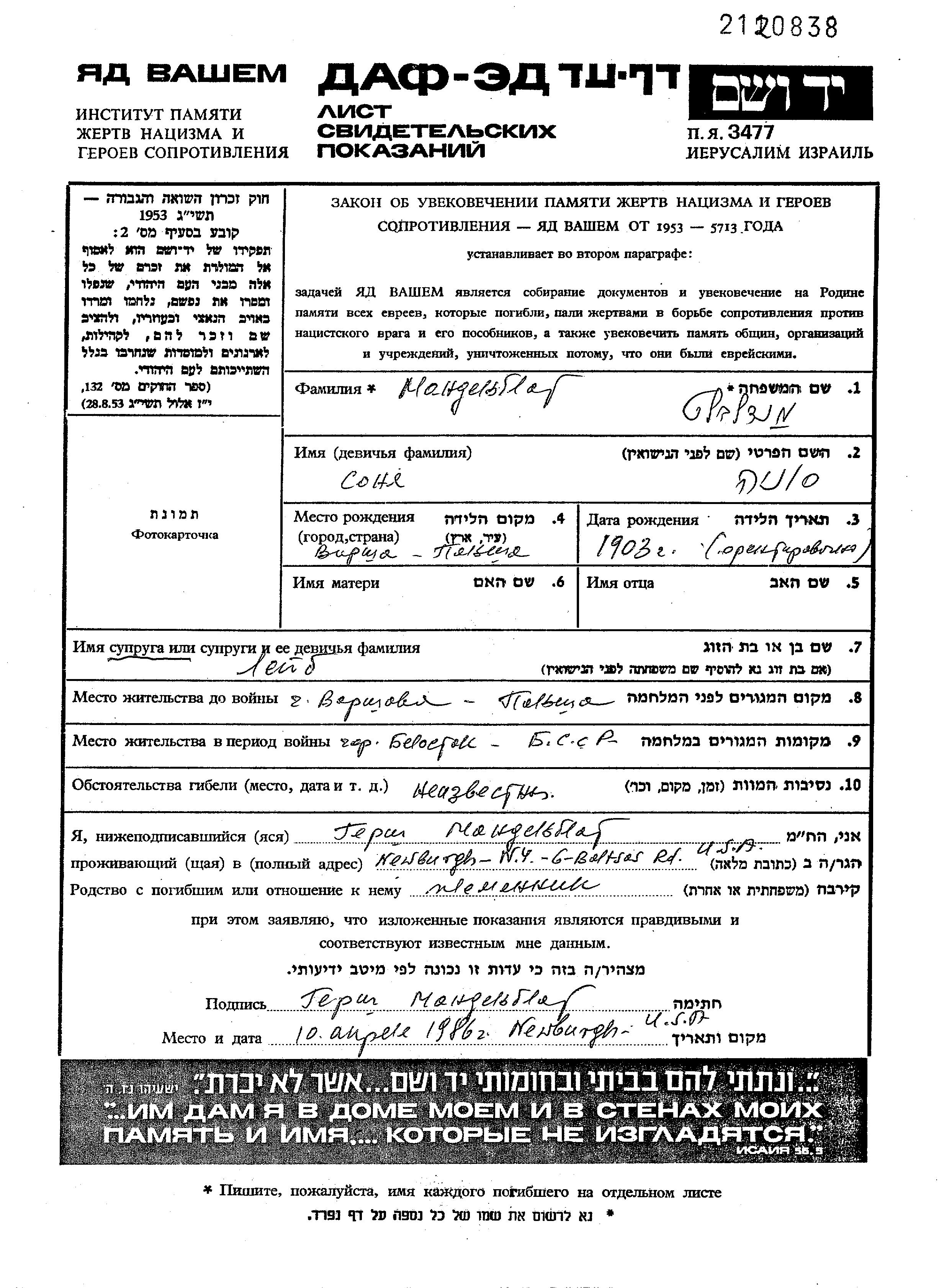 Sonya Mandelblat wurde im Jahr 1903 in Warszawa, Polen geboren. Sie war mit Leib Verheiratet. Vor dem Zweiten Weltkrieg lebte sie in Warszawa, Polen. Während des Krieges war sie in Bialystok, Polen.