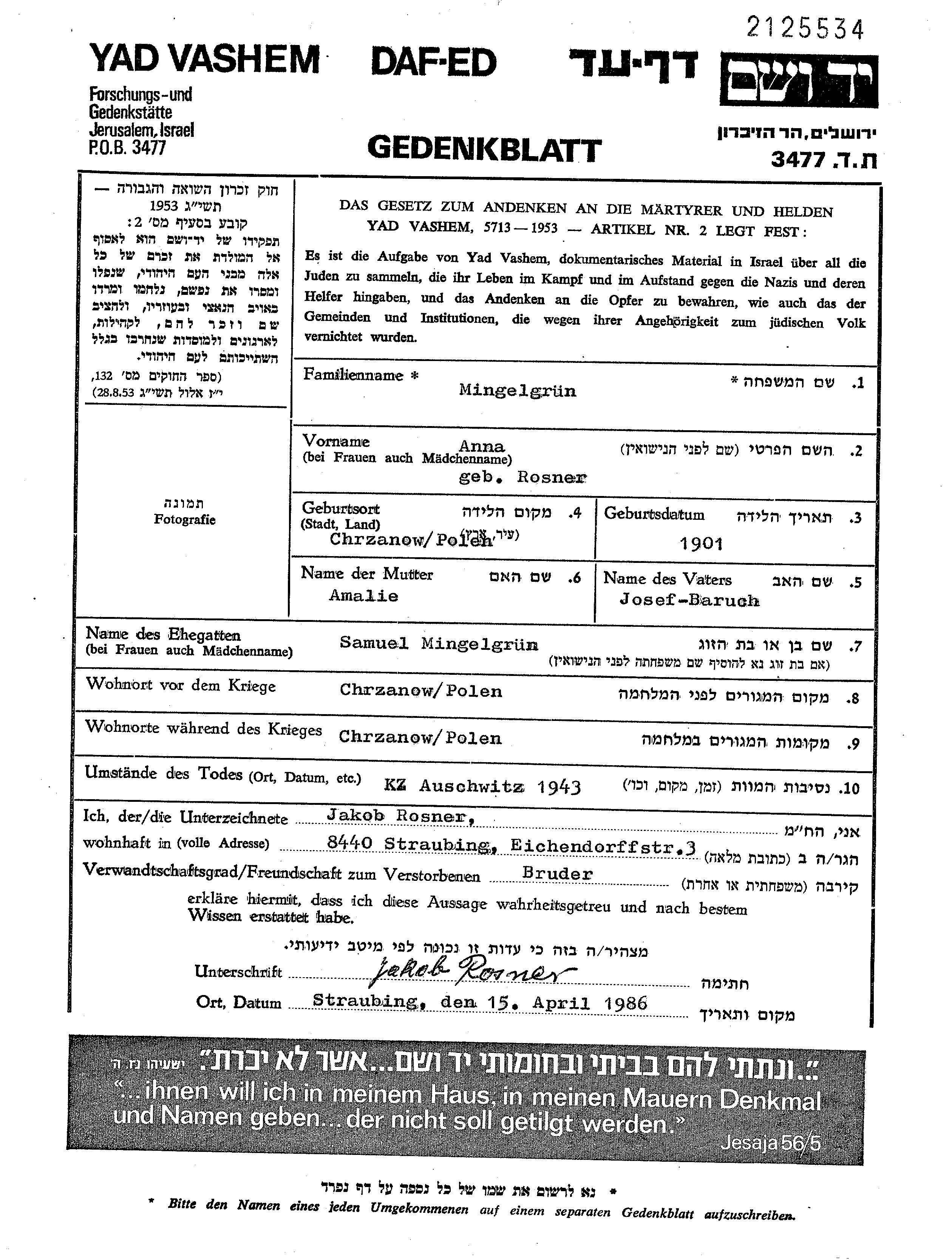 Anna Mingelgrün, geb. Rosner wurde im Jahr 1901 in Chrzanow, Polen geboren. Sie war die Tochter von Josef Baruch und Amalie. Sie war mit Shmuel Verheiratet. Vor dem Zweiten Weltkrieg lebte sie in Chrzanow, Polen. Während des Krieges war sie in Chrzanow, Polen.