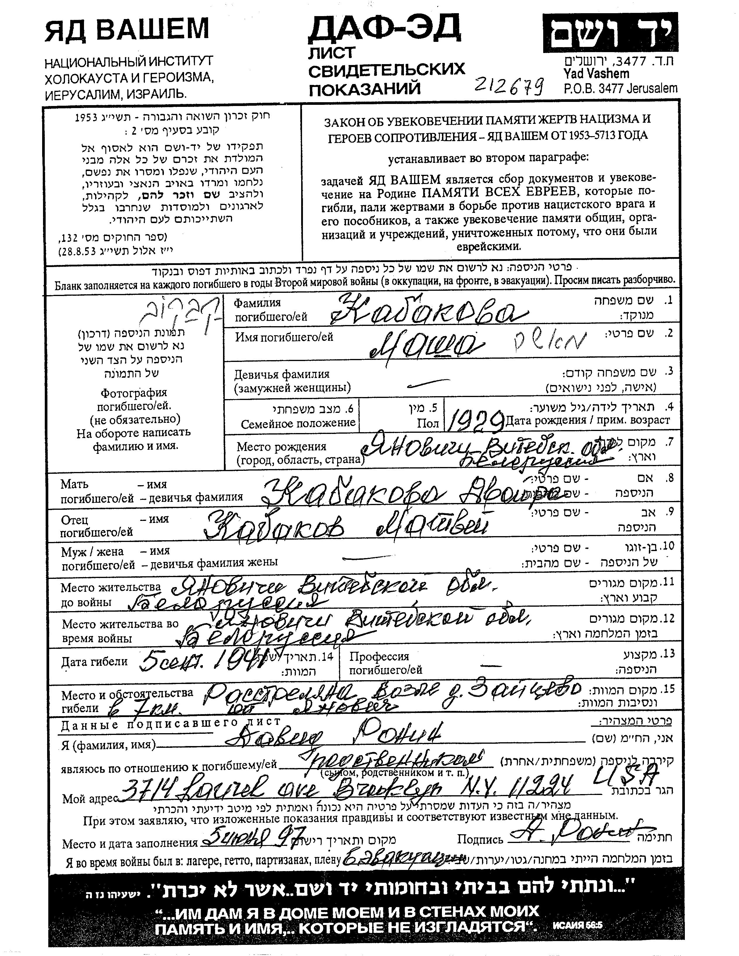 Kabakov Masha 1929 Yanovichi, Weißrussland (UdSSR) Gedenkblatt