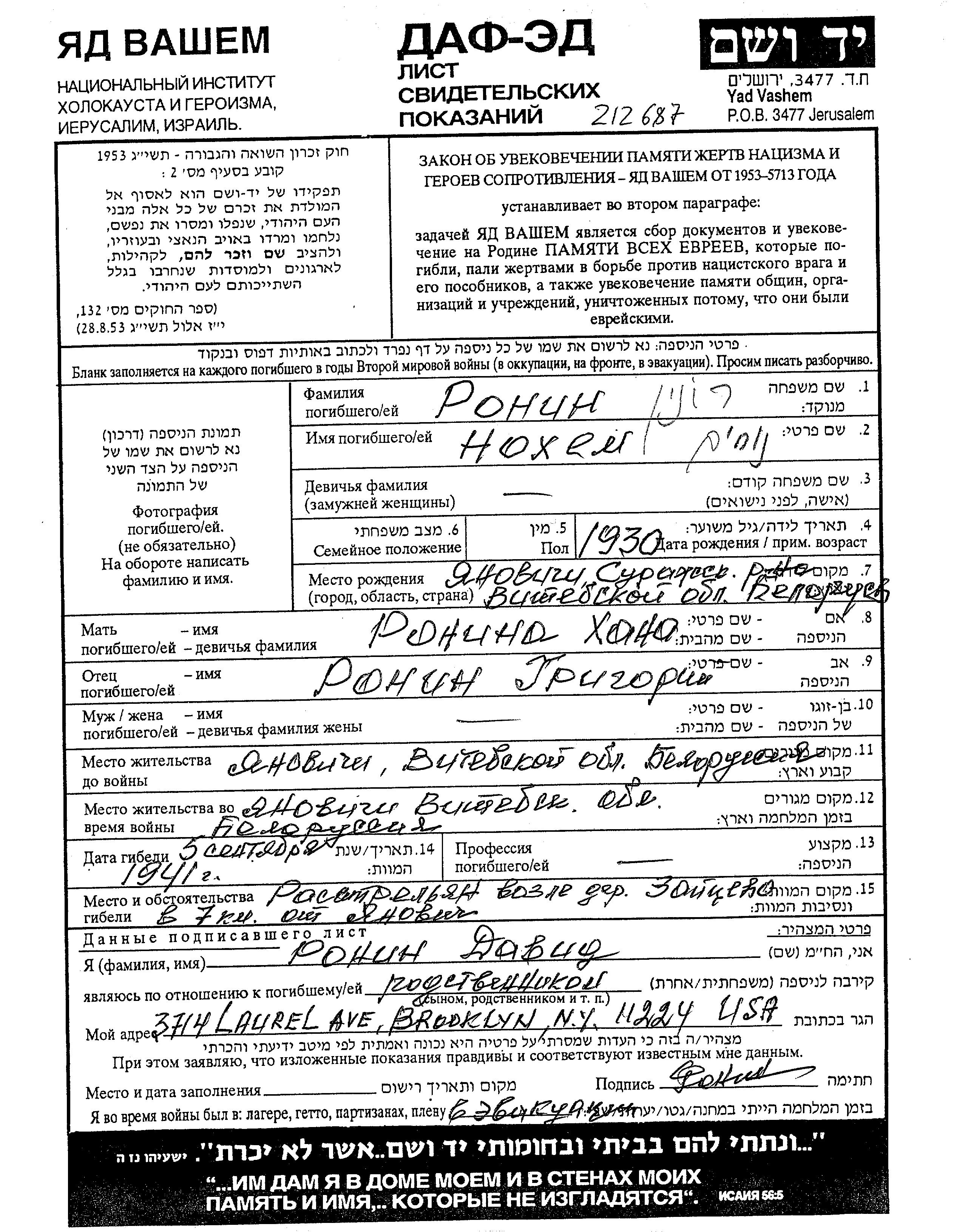 Nukhem Ronin wurde im Jahr 1930 in Yanovichi, Weißrussland (UdSSR) geboren. Er war der Sohn von Grigori und Khana. Er war Kind. Vor dem Zweiten Weltkrieg lebte er in Yanovichi, Weißrussland (UdSSR). Während des Krieges war er in Yanovichi, Weißrussland (UdSSR).