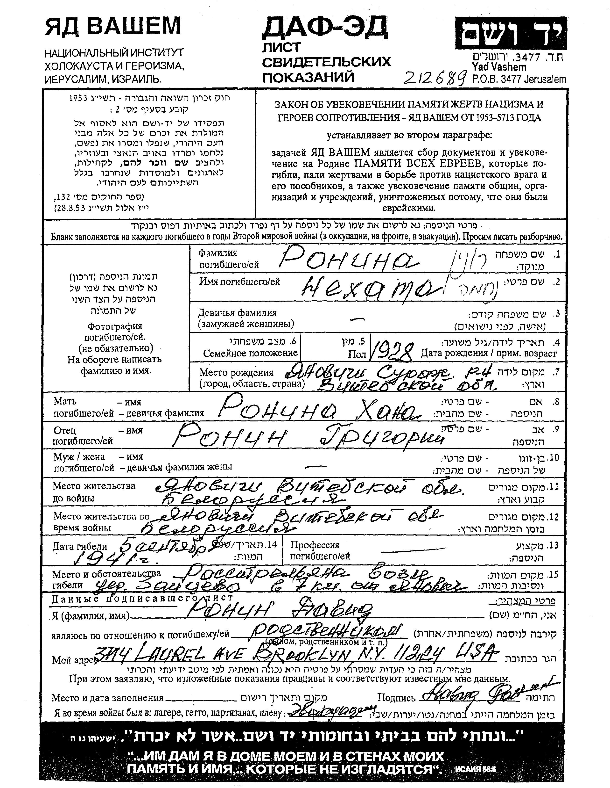 Nekhama Ronin wurde im Jahr 1928 in Yanovichi, Weißrussland (UdSSR) geboren. Sie war die Tochter von Grigori und Khana. Vor dem Zweiten Weltkrieg lebte sie in Yanovichi, Weißrussland (UdSSR). Während des Krieges war sie in Yanovichi, Weißrussland (UdSSR).