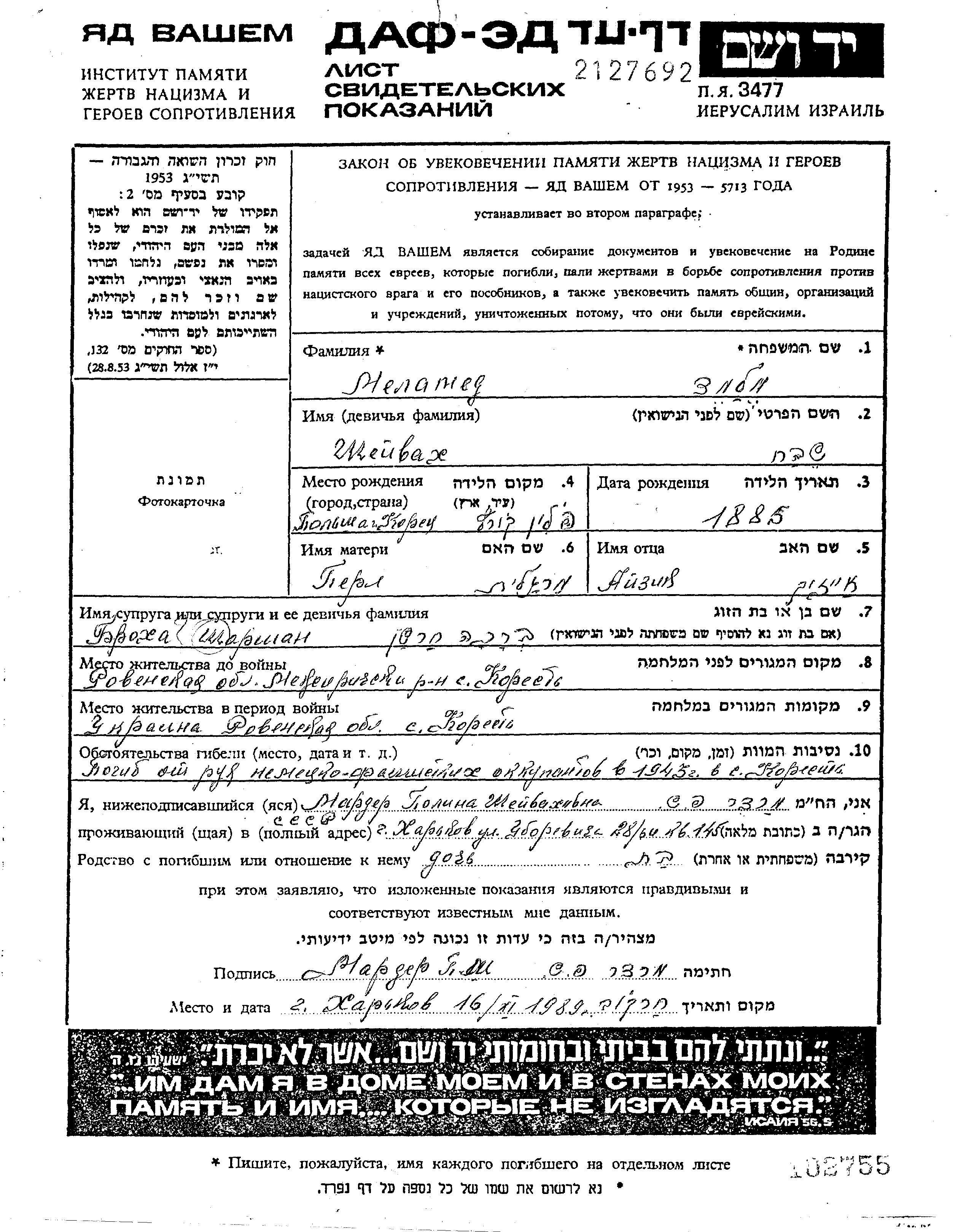 Sheivakh wurde in der Schoah ermordet. Todesort: Korost, Polen im Jahr 1943.