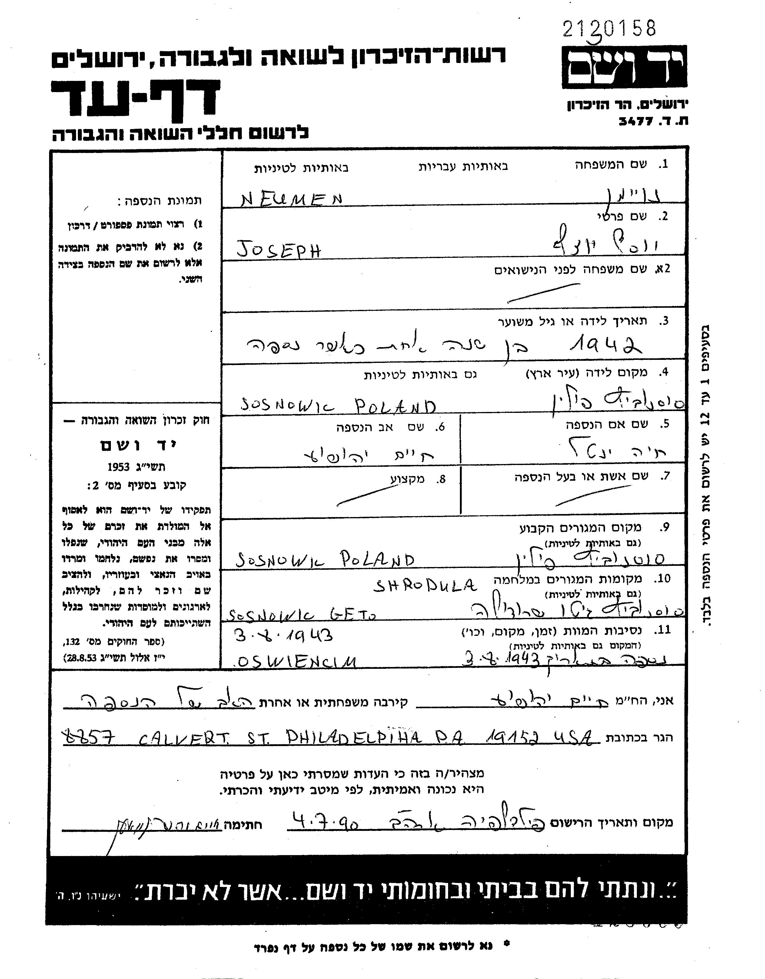 Joseph Neumen wurde im Jahr 1942 in Sosnowiec, Polen geboren. Er war der Sohn von Khaim Yehoshua und Yentel Khaia, geb. Pinchevski. Er war Kind. Vor dem Zweiten Weltkrieg lebte er in Sosnowiec, Polen. Während des Krieges war er in Sosnowiec, Polen.