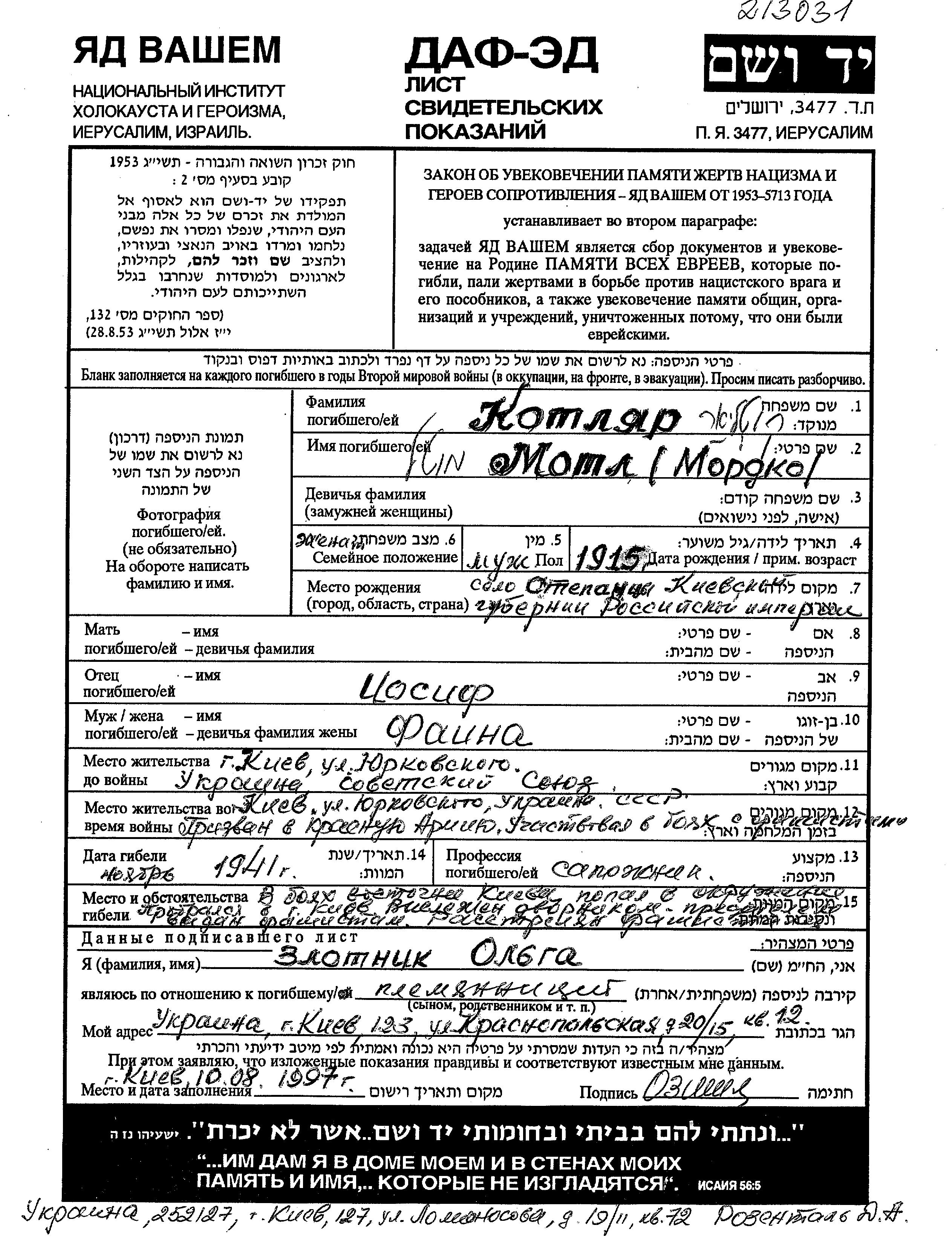 Kotlyar Motl 1915 Kiyev, Ukraine (UdSSR) Gedenkblatt