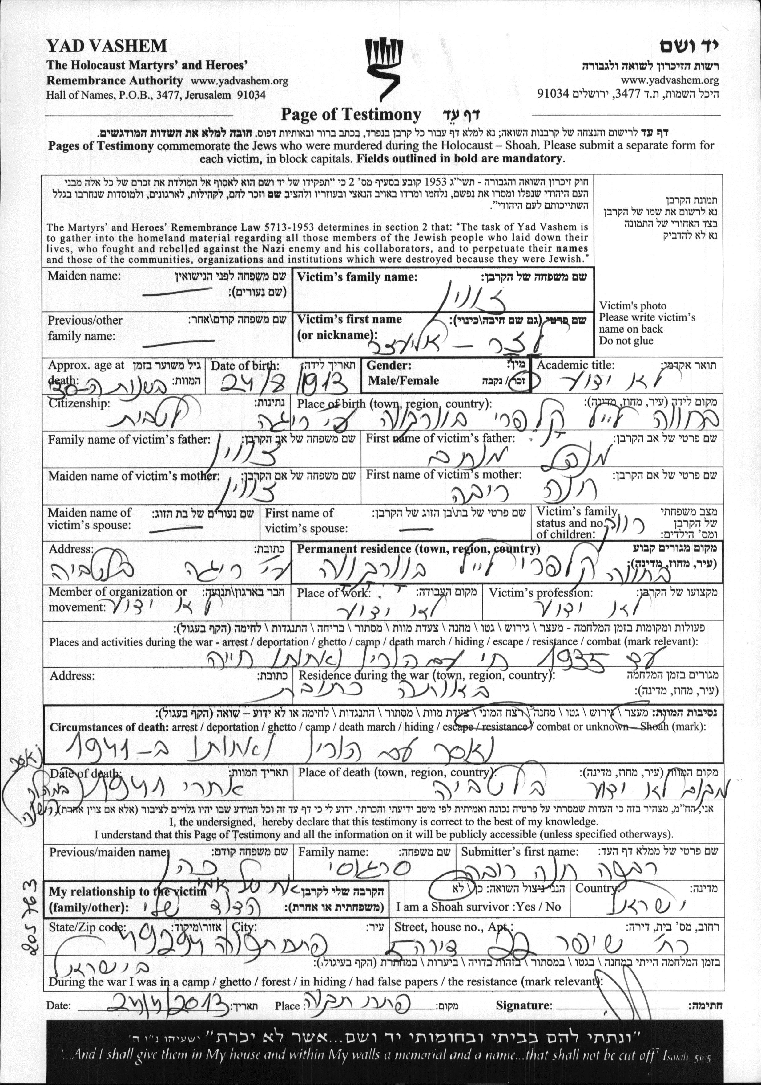 Zvein | Eliezer | 1913 | Varkava, Lettland | Gedenkblatt (digital, unterzeichnet) |