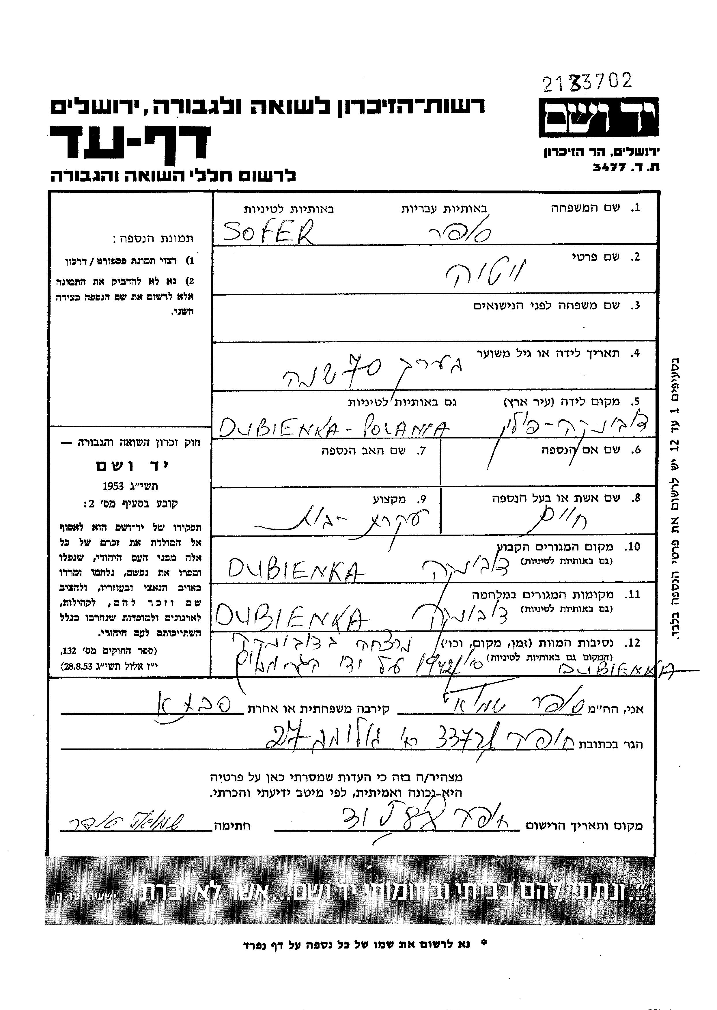 Vitia Sofer wurde im Jahr 1872 in Dubienka, Polen geboren. Sie war Hausfrau und mit Haim Verheiratet. Vor dem Zweiten Weltkrieg lebte sie in Dubienka, Polen. Während des Krieges war sie in Dubienka, Polen.
