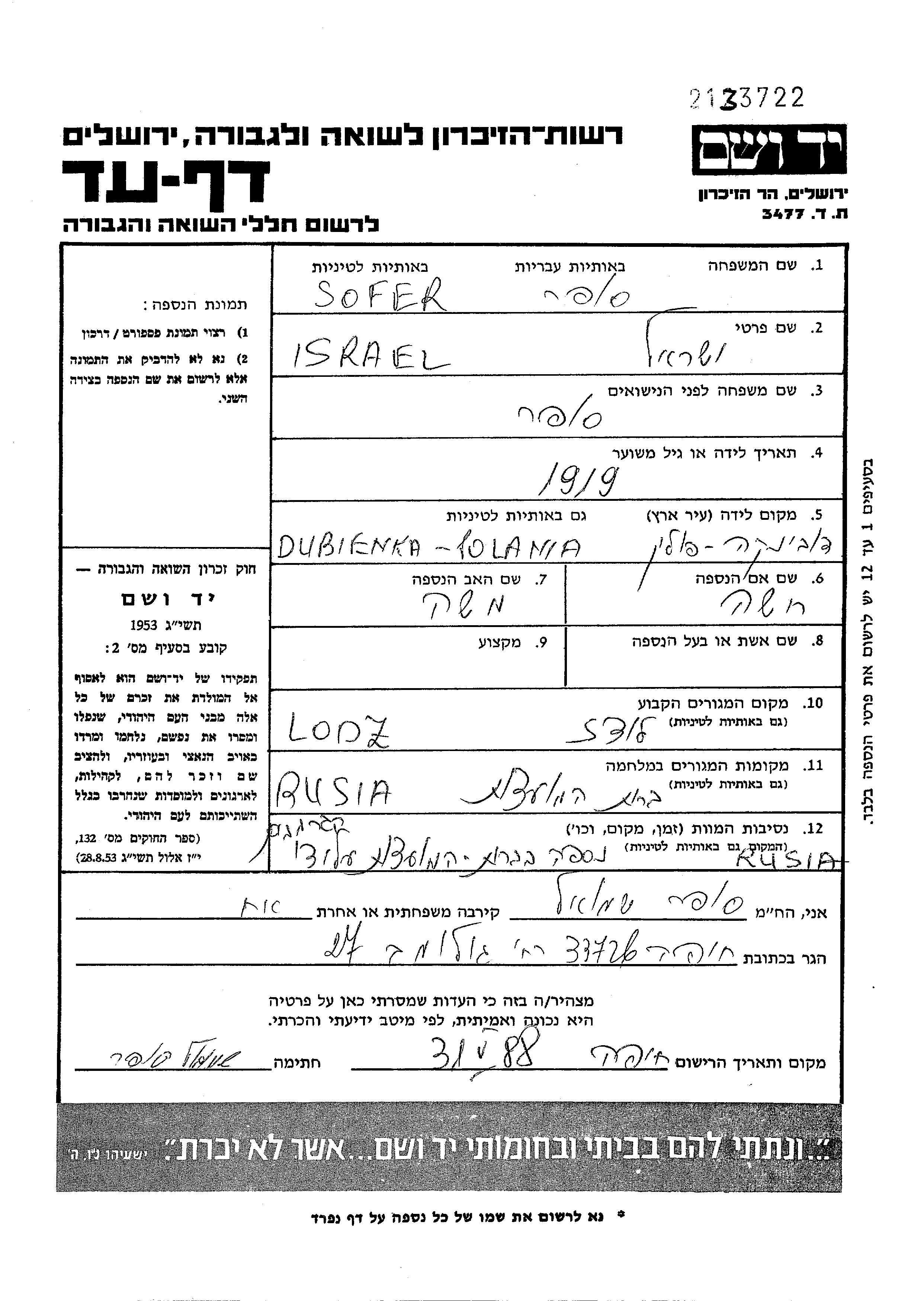 Israel Sofer wurde im Jahr 1919 in Dubienka, Polen geboren. Er war der Sohn von Mose und Risa, geb. Grais. Vor dem Zweiten Weltkrieg lebte er in Lodz, Polen. Während des Krieges war er in Russland (UdSSR).
