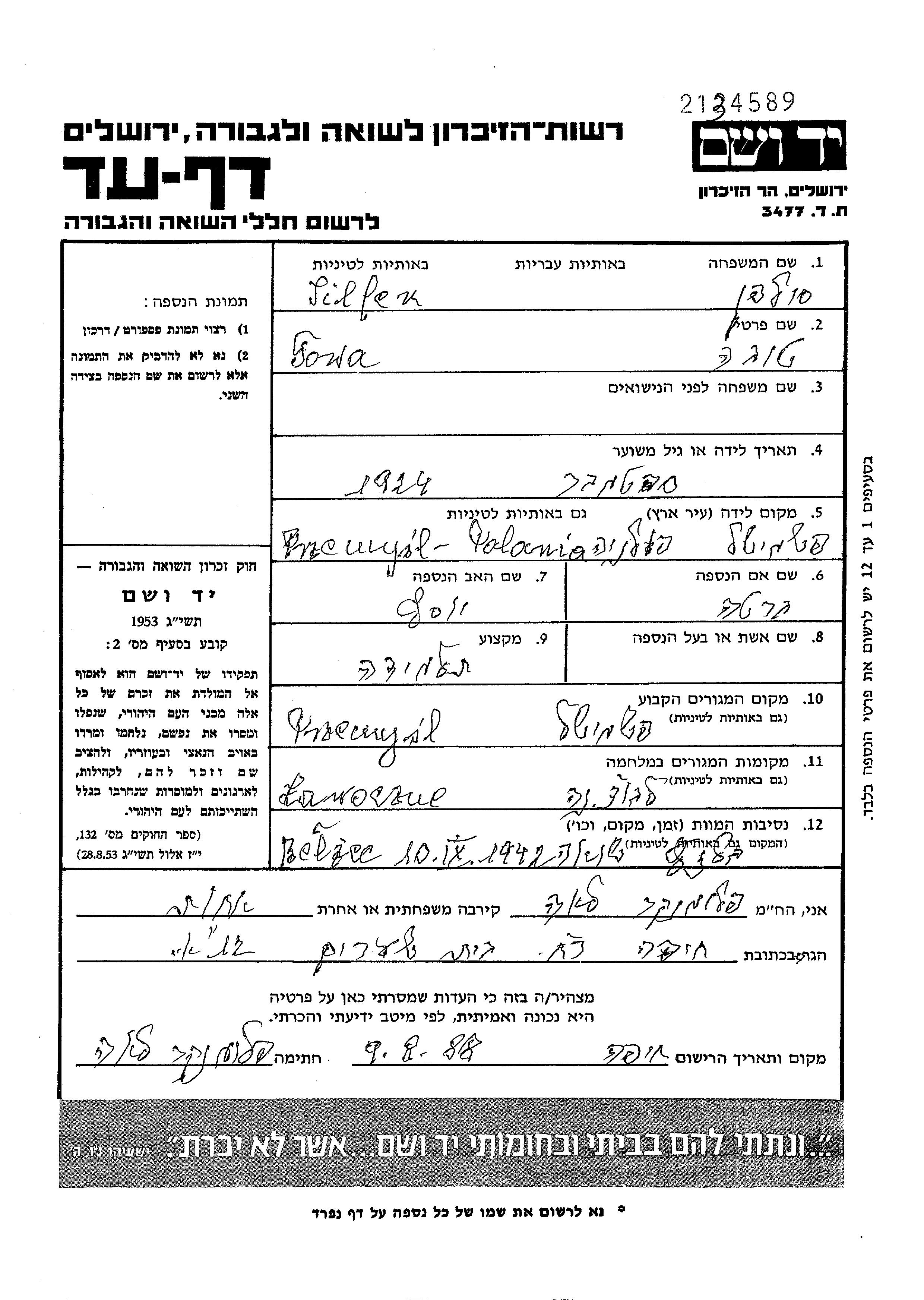 Towa Silfen wurde im Jahr 1924 in Przemysl, Polen geboren. Sie war die Tochter von Yosef und Bronia Berta, geb. Segal. Sie war Schüler/-in. Vor dem Zweiten Weltkrieg lebte sie in Przemysl, Polen. Während des Krieges war sie in Lawoczne, Polen.