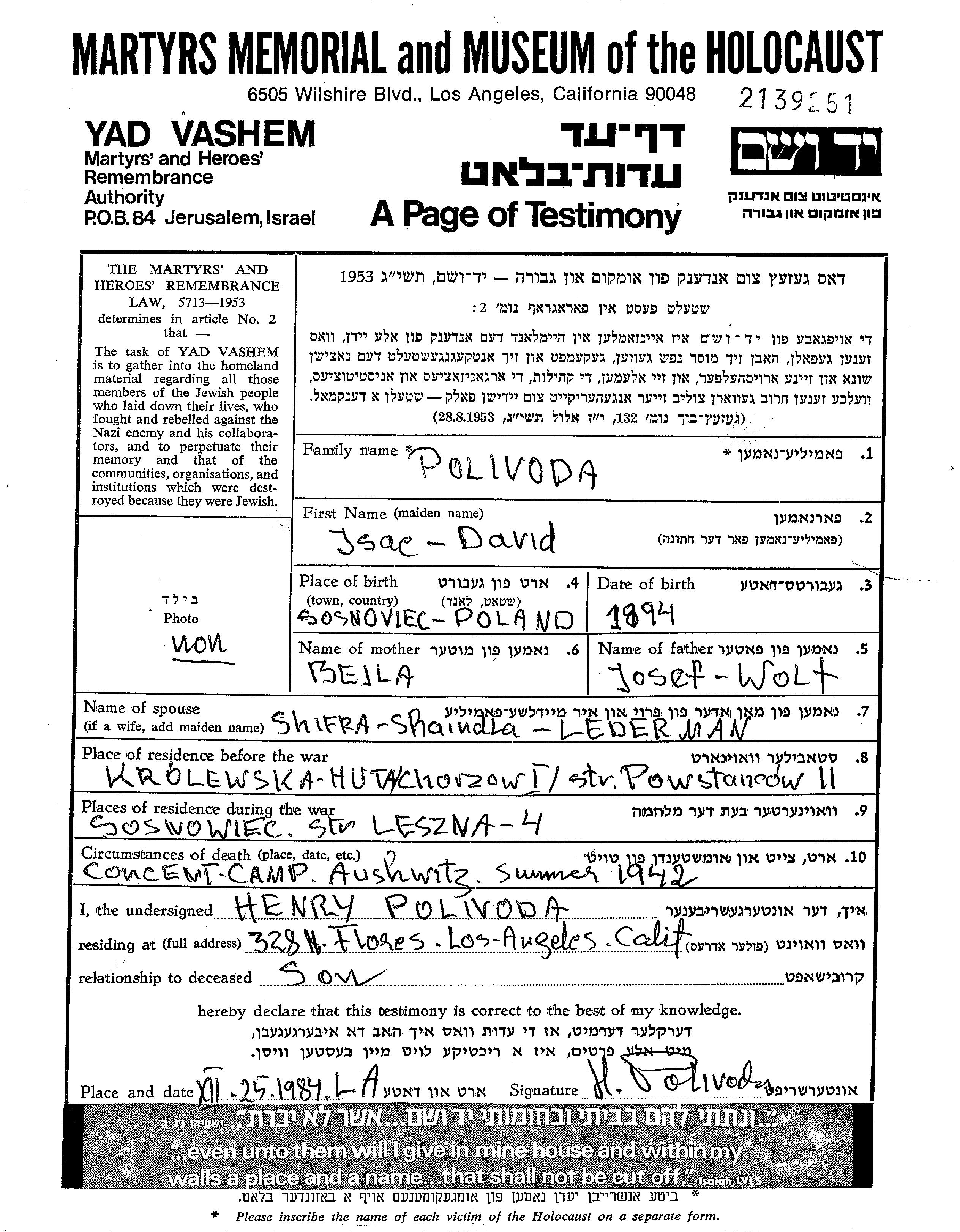 Isac David Polivoda wurde im Jahr 1894 in Sosnowiec, Polen geboren. Er war der Sohn von Josef Wolf und Bejla. Er war mit Shaindla Shifra Verheiratet. Vor dem Zweiten Weltkrieg lebte er in Krolewska Huta, Polen. Während des Krieges war er in Sosnowiec, Polen.