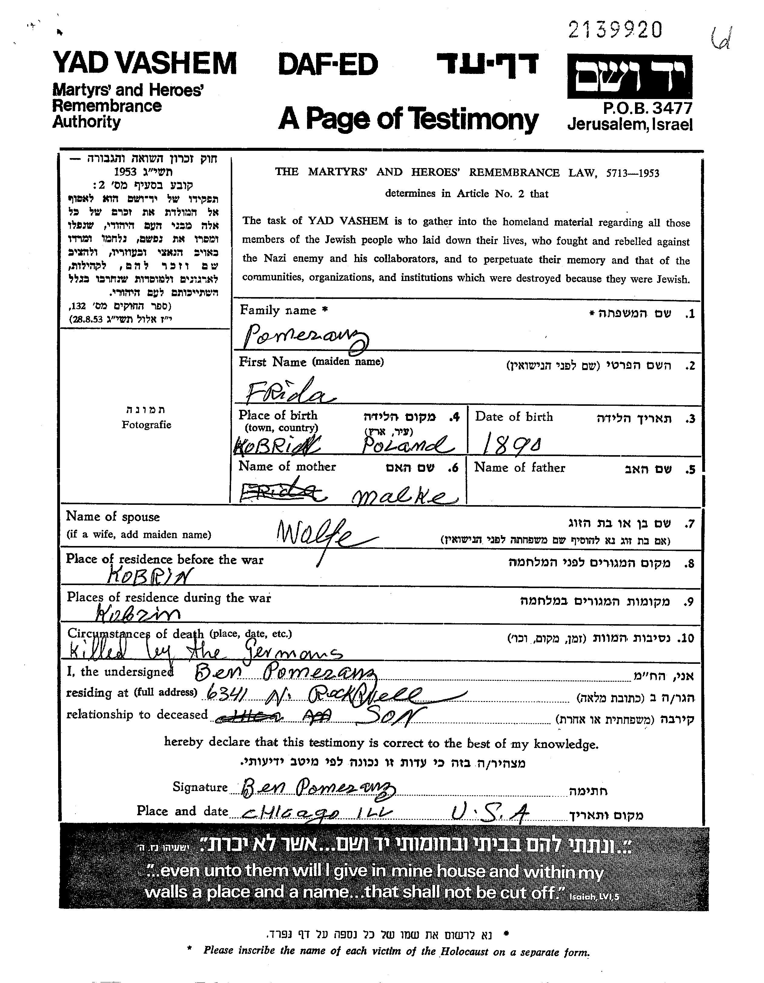 Frida Pomerantz wurde in Kobryn, Polen geboren. Sie war die Tochter von Beniamin und Malke. Sie war mit Velvl Verheiratet. Vor dem Zweiten Weltkrieg lebte sie in Kobryn, Polen. Während des Krieges war sie in Kobryn, Polen.
