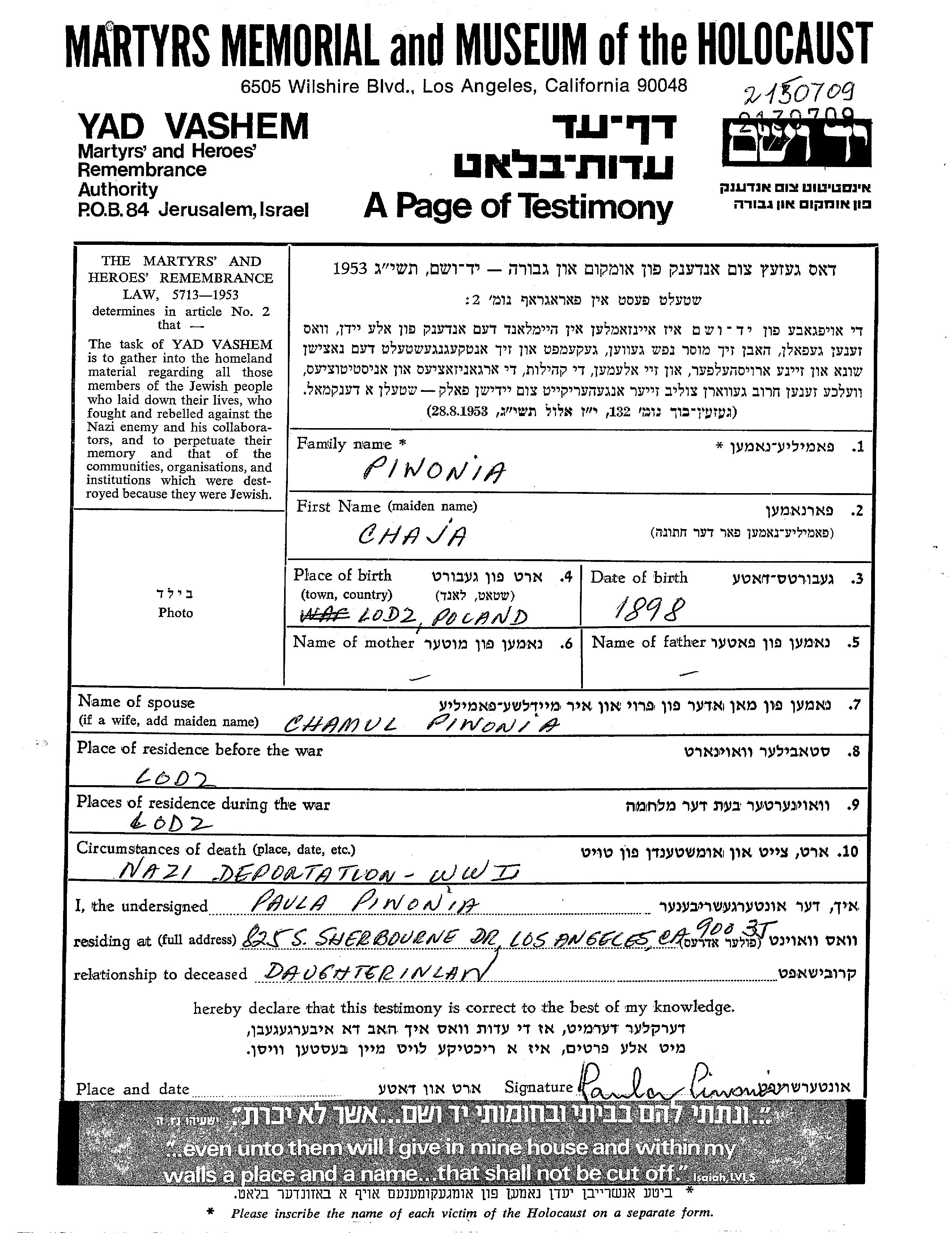 Chaja Piwonia wurde in Lodz, Polen geboren. Sie war mit Chamul Verheiratet. Vor dem Zweiten Weltkrieg lebte sie in Lodz, Polen. Während des Krieges war sie in Lodz, Polen.