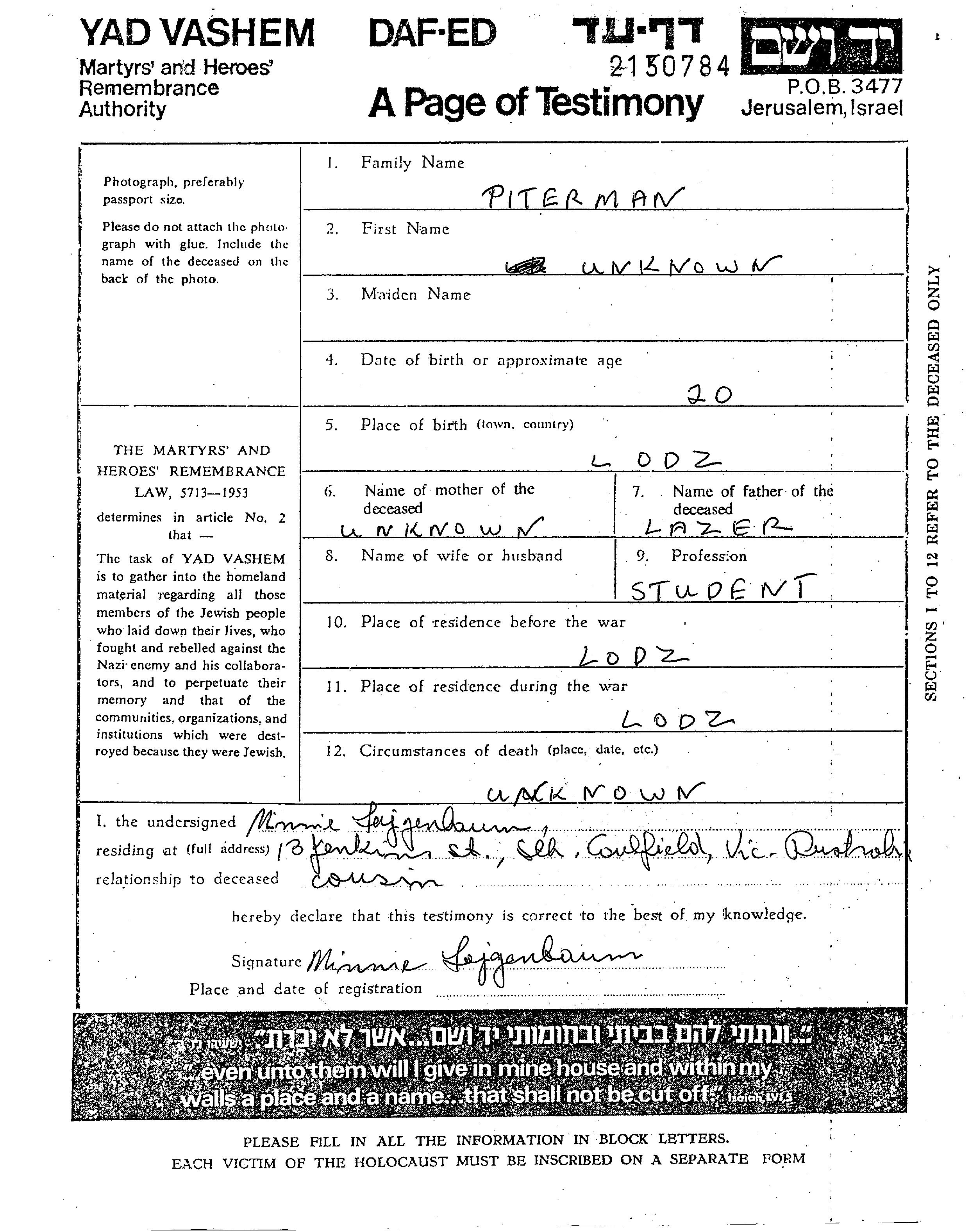 Vorname unbekannt Piterman Fiterman wurde in Lodz, Polen geboren. Er/sie war der/ die Sohn/Tochter von Lazer. Er/Sie war Student. Vor dem Zweiten Weltkrieg er/sie in Lodz, Polen. Während des Krieges war er/sie in Lodz, Polen.