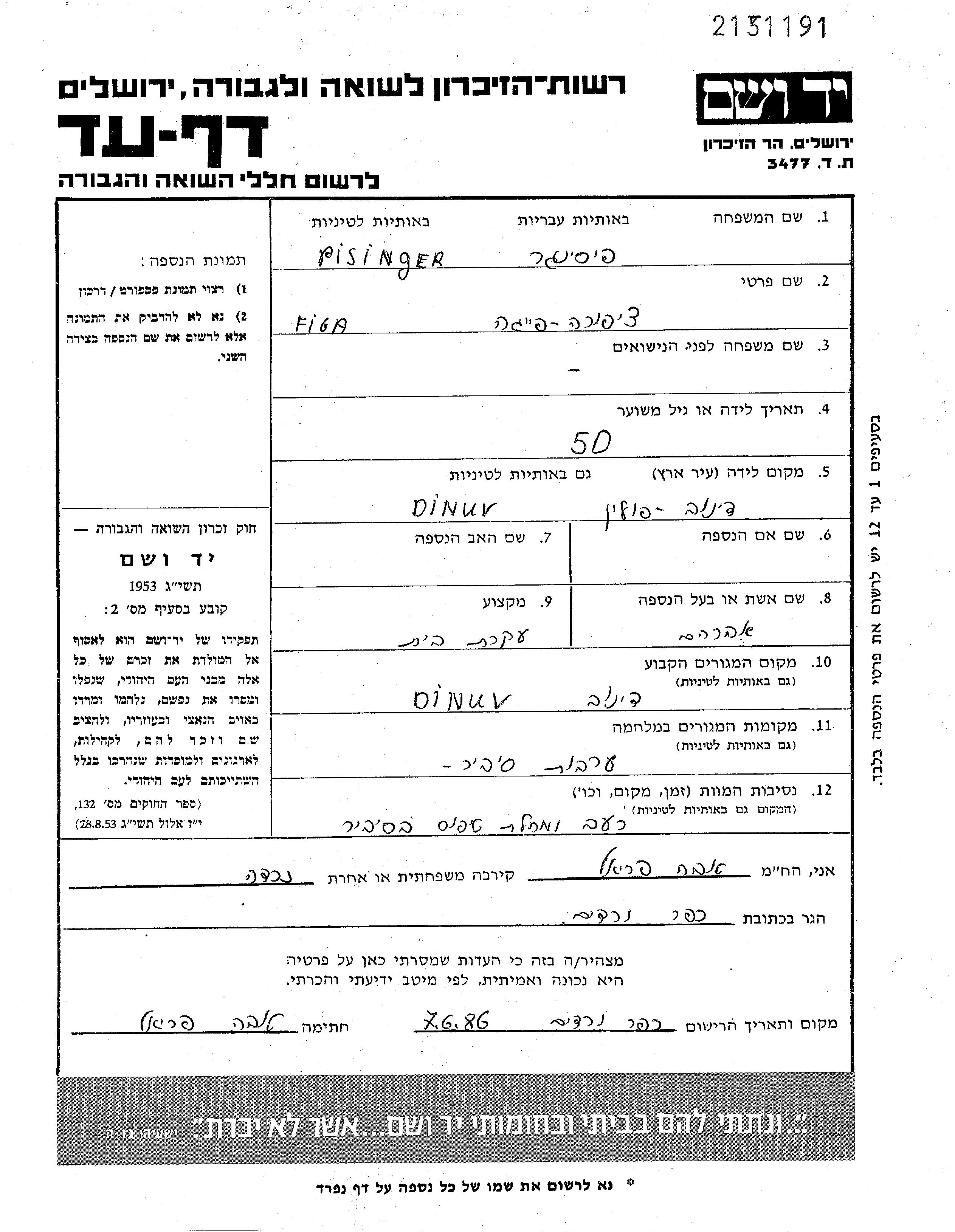 Figa Tzipora Pisinger wurde in Dynow, Polen geboren. Sie war Hausfrau und mit Avraham Verheiratet. Vor dem Zweiten Weltkrieg lebte sie in Dynow, Polen. Während des Krieges war sie in Sibiria, Russland (UdSSR).