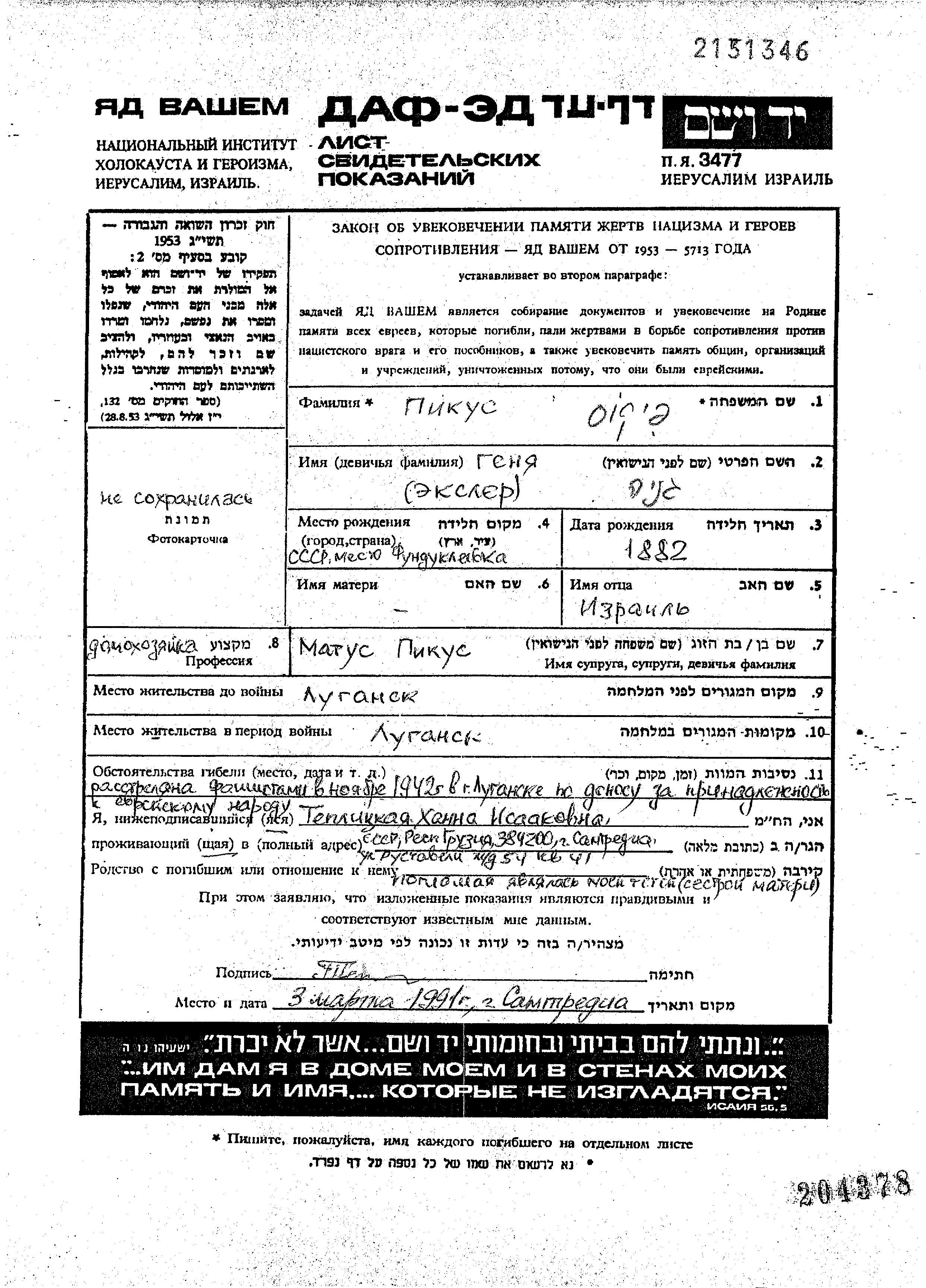 Genya Pikus, geb. Eksler wurde im Jahr 1882 in Fundukleyevka, Ukraine (UdSSR) geboren. Sie war die Tochter von Izrail. Sie war Hausfrau und mit Matus Verheiratet. Vor dem Zweiten Weltkrieg lebte sie in Lugansk, Ukraine (UdSSR). Während des Krieges war sie in Lugansk, Ukraine (UdSSR).