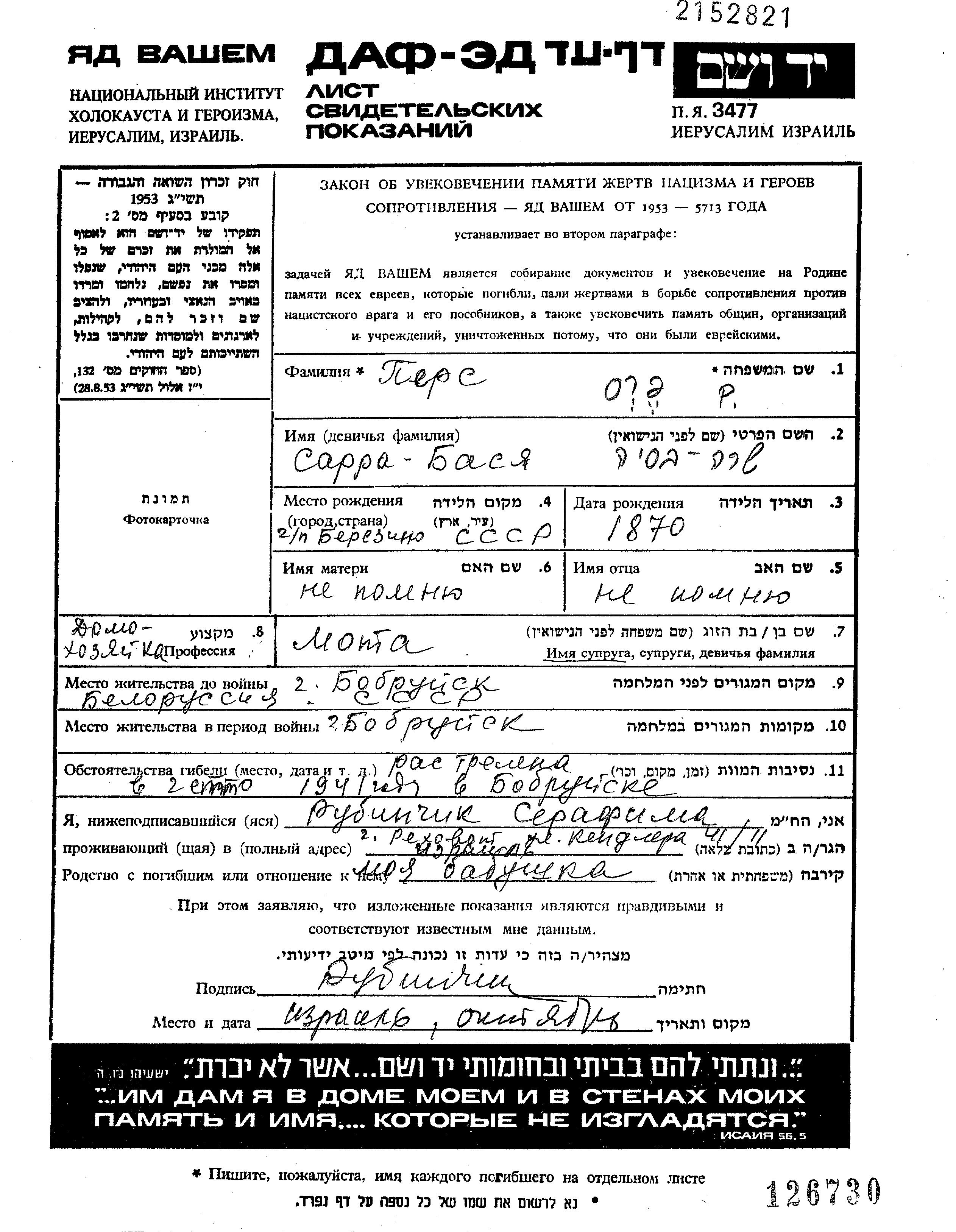 Basya Sara Pers Pres wurde im Jahr 1870 in Berezino, Weißrussland (UdSSR) geboren. Sie war Hausfrau und mit Mota Mota Verheiratet. Vor dem Zweiten Weltkrieg lebte sie in Bobruysk, Weißrussland (UdSSR). Während des Krieges war sie in Bobruysk, Weißrussland (UdSSR).
