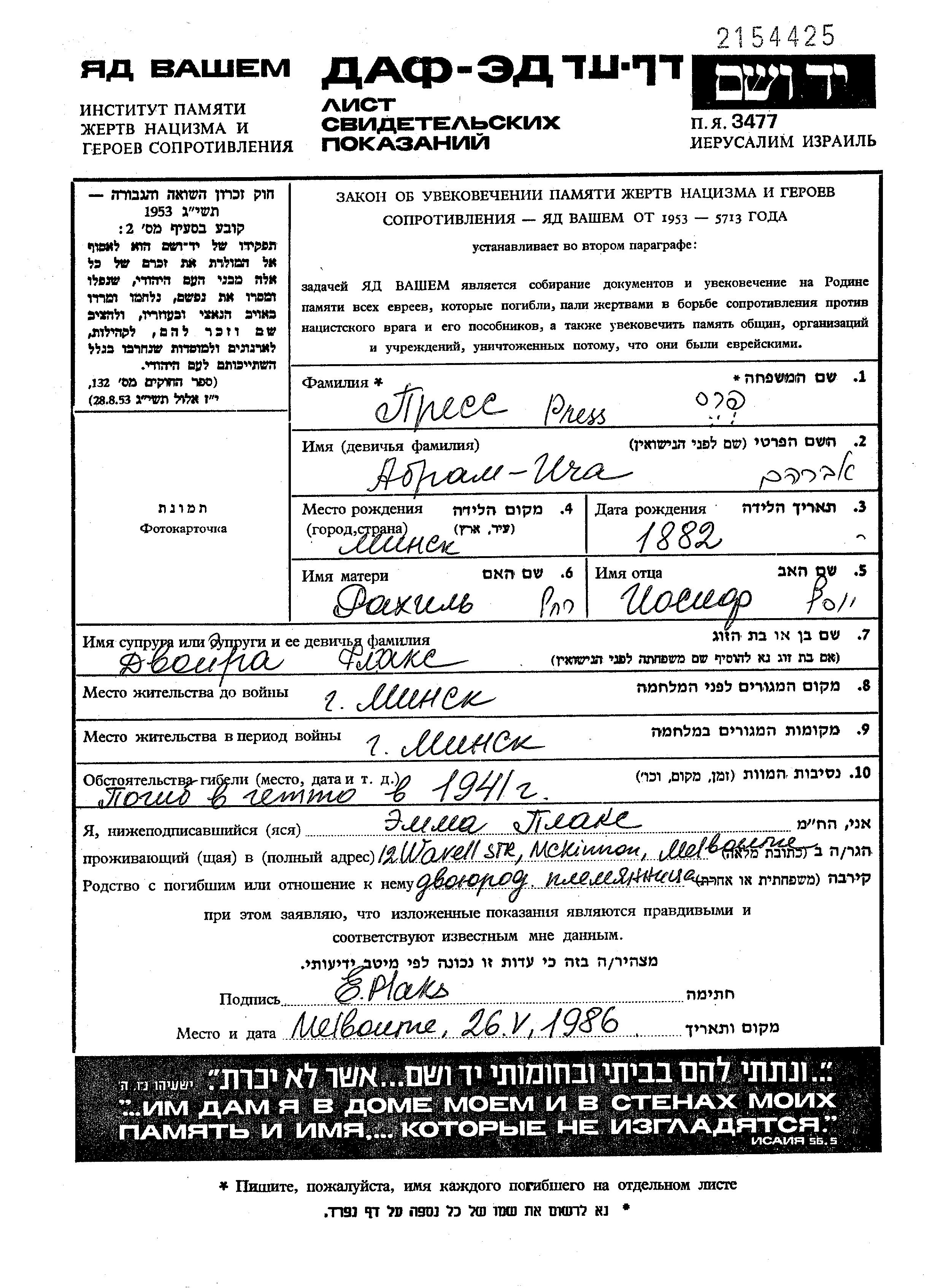 Abram Icha Pres wurde im Jahr 1882 in Minsk, Weißrussland (UdSSR) geboren. Er war der Sohn von Iosif und Rakhil. Er war mit Dvoira Verheiratet. Vor dem Zweiten Weltkrieg lebte er in Minsk, Weißrussland (UdSSR). Während des Krieges war er in Minsk, Weißrussland (UdSSR).