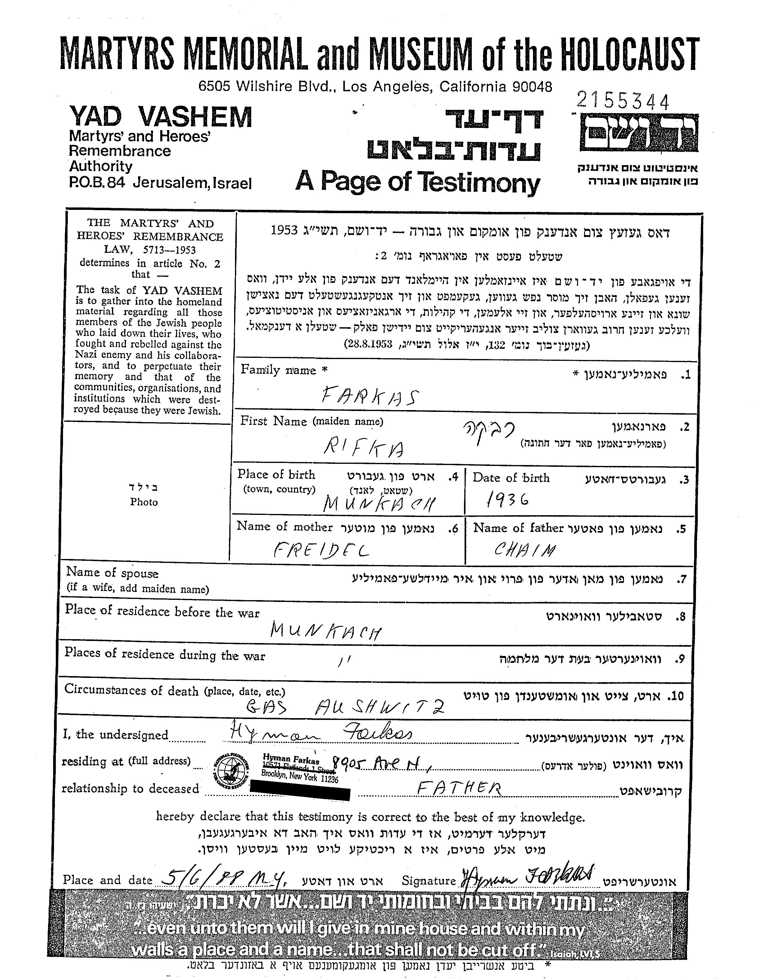 Rivka Farkas wurde im Jahr 1936 in Munkacs, Tschechoslowakei geboren. Sie war die Tochter von Chaim und Freidel Freidel. Sie war Kind. Vor dem Zweiten Weltkrieg lebte sie in Munkacs, Tschechoslowakei. Während des Krieges war sie in Munkacs, Tschechoslowakei.