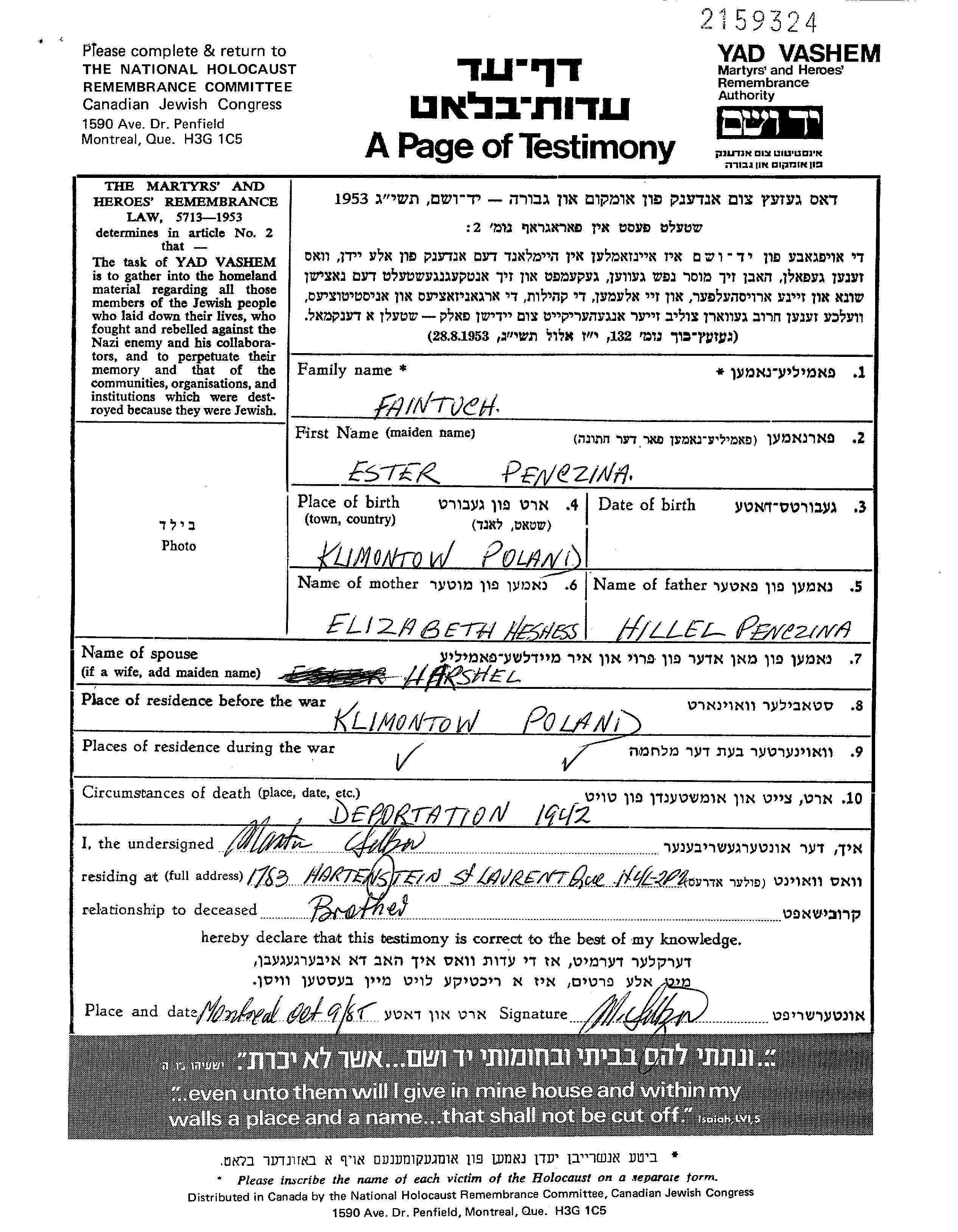 Ester Faintuch, geb. Penczina wurde in Klimontow, Polen geboren. Sie war die Tochter von Hilel und Elizabeth, geb. Heshess. Sie war mit Harshel Verheiratet. Vor dem Zweiten Weltkrieg lebte sie in Klimontow, Polen. Während des Krieges war sie in Klimontow, Polen.