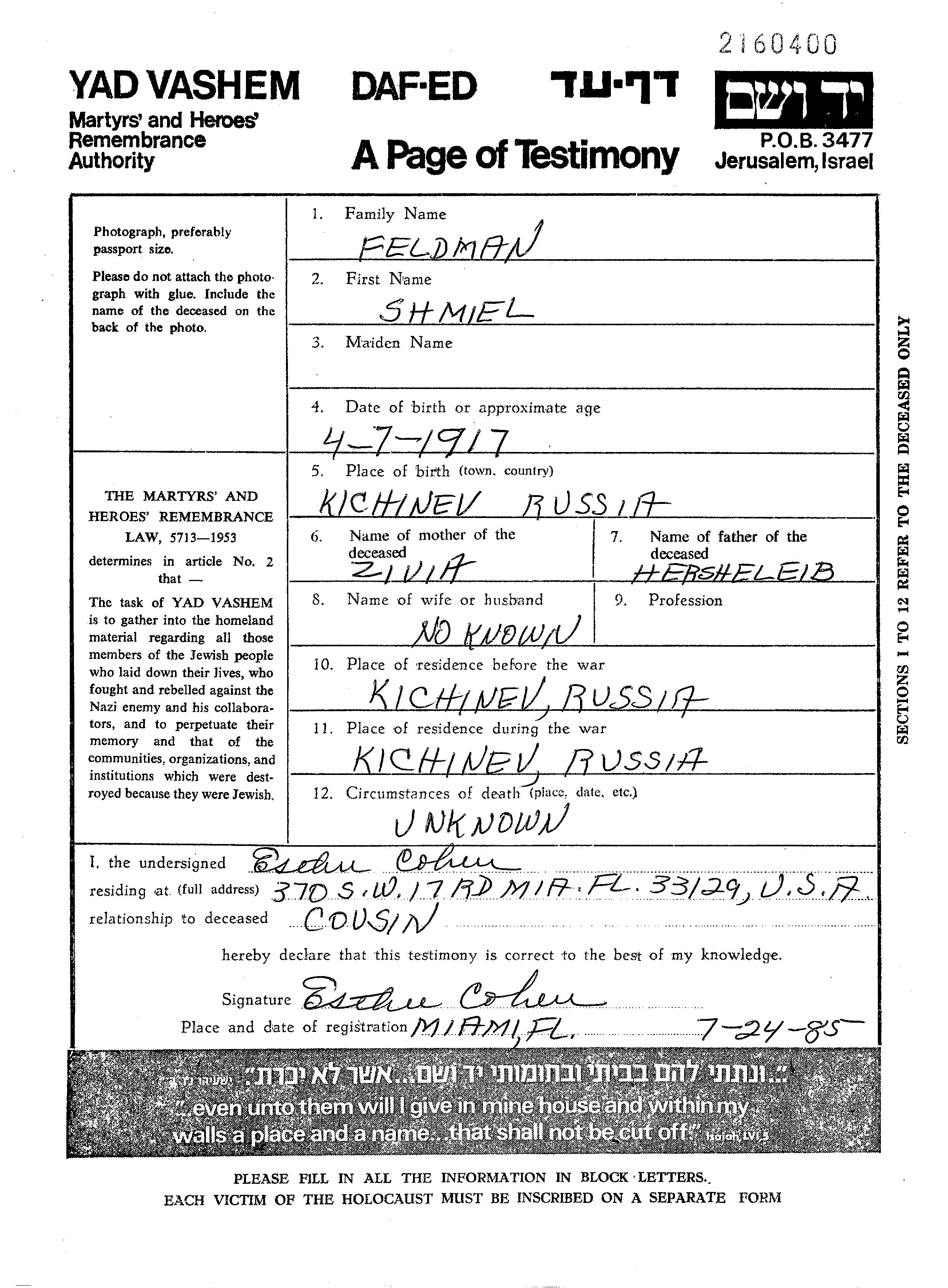 Shmiel Feldman wurde im Jahr 1917 in Kishinev, Rumänien geboren. Er war der Sohn von Hersh Leib und Zivia Tzvia. Vor dem Zweiten Weltkrieg lebte er in Kishinev, Rumänien. Während des Krieges war er in Kishinev, Rumänien.