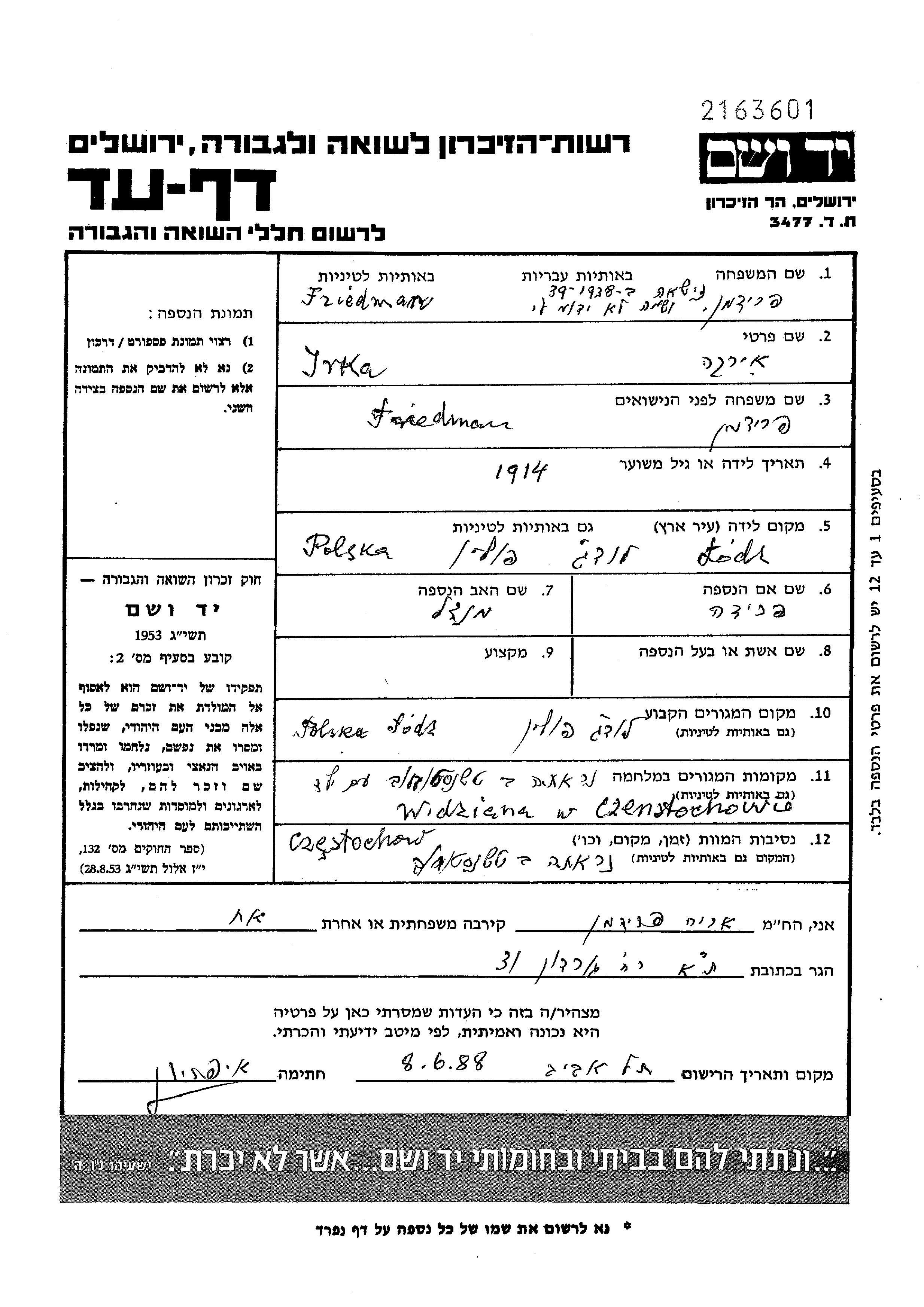 Irka Name unbekannt, geb. Friedman wurde im Jahr 1914 in Lodz, Polen geboren. Sie war die Tochter von Mendel und Frieda, geb. Zaklikowski. Sie war Verheiratet. Vor dem Zweiten Weltkrieg lebte sie in Lodz, Polen. Während des Krieges war sie in Czestochowa, Polen.