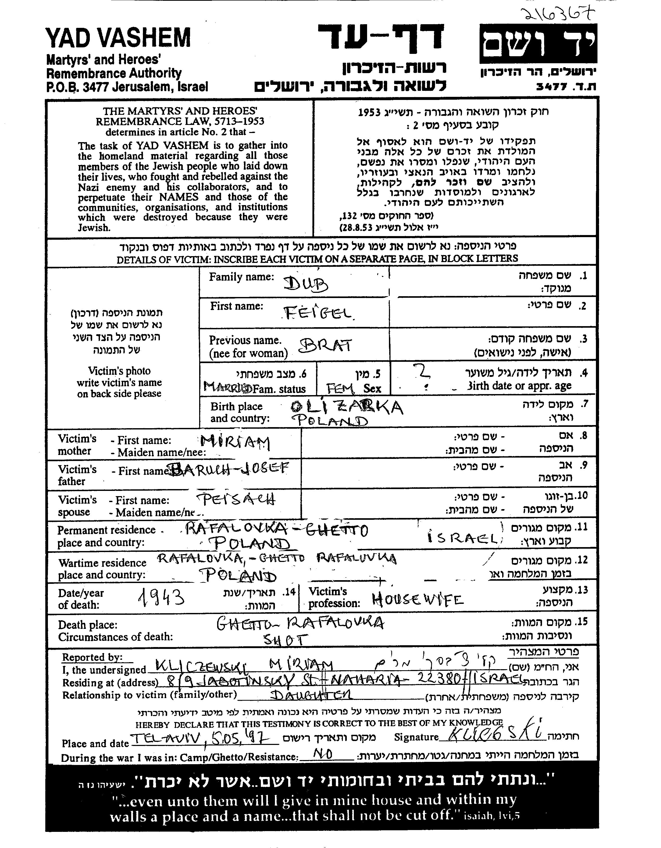 Feigel Dub Dov, geb. Bart wurde in Olizarka, Polen geboren. Sie war die Tochter von Baruch Josef und Miriam. Sie war Hausfrau und mit Peisach Verheiratet. Vor dem Zweiten Weltkrieg lebte sie in Rafałówka, Polen. Während des Krieges war sie in Rafałówka, Polen.