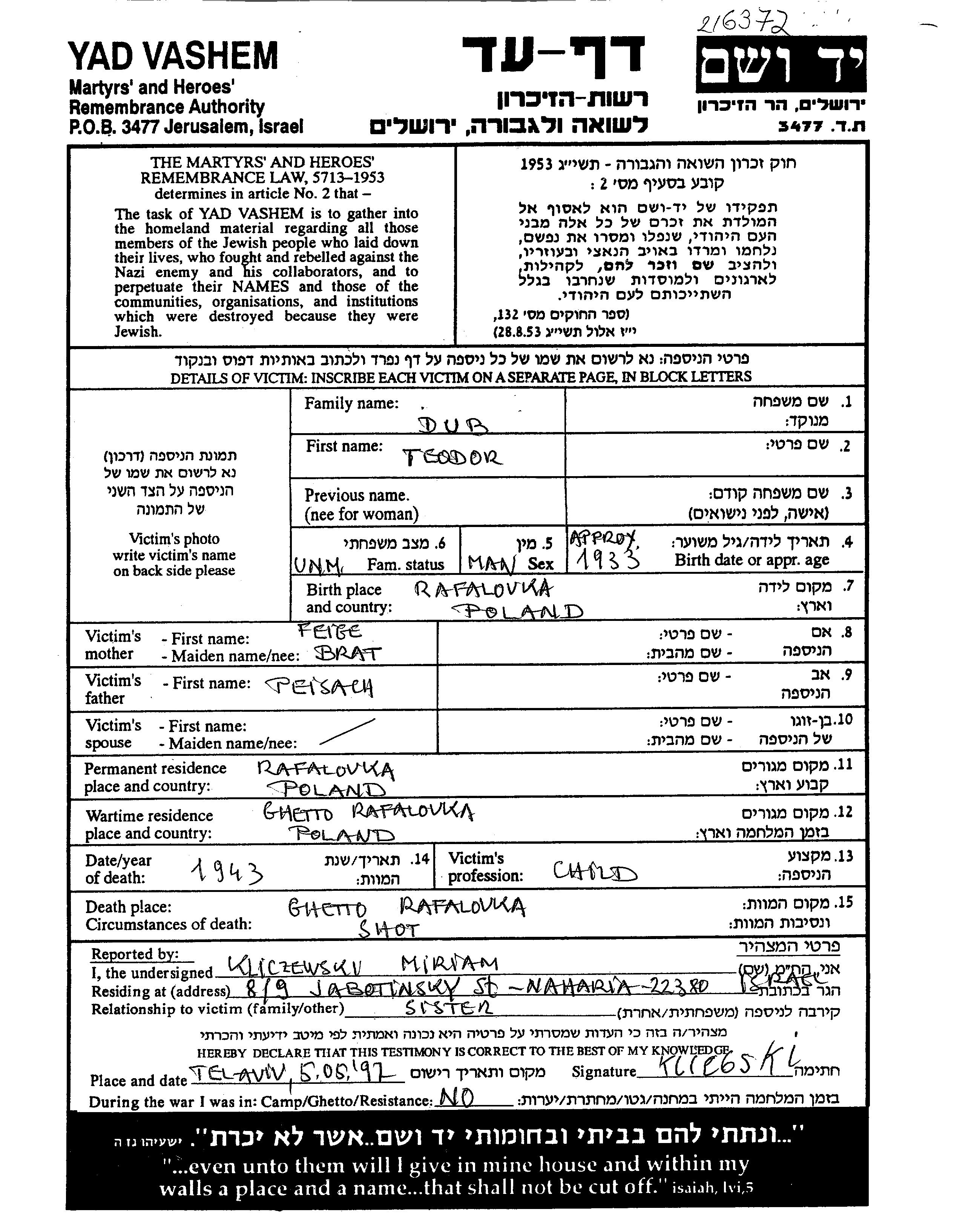 Teodor Dub Dov wurde im Jahr 1933 in Rafałówka, Polen geboren. Er war der Sohn von Peisach und Feiga, geb. Bart. Er war Kind. Vor dem Zweiten Weltkrieg lebte er in Rafałówka, Polen. Während des Krieges war er in Rafałówka, Polen.