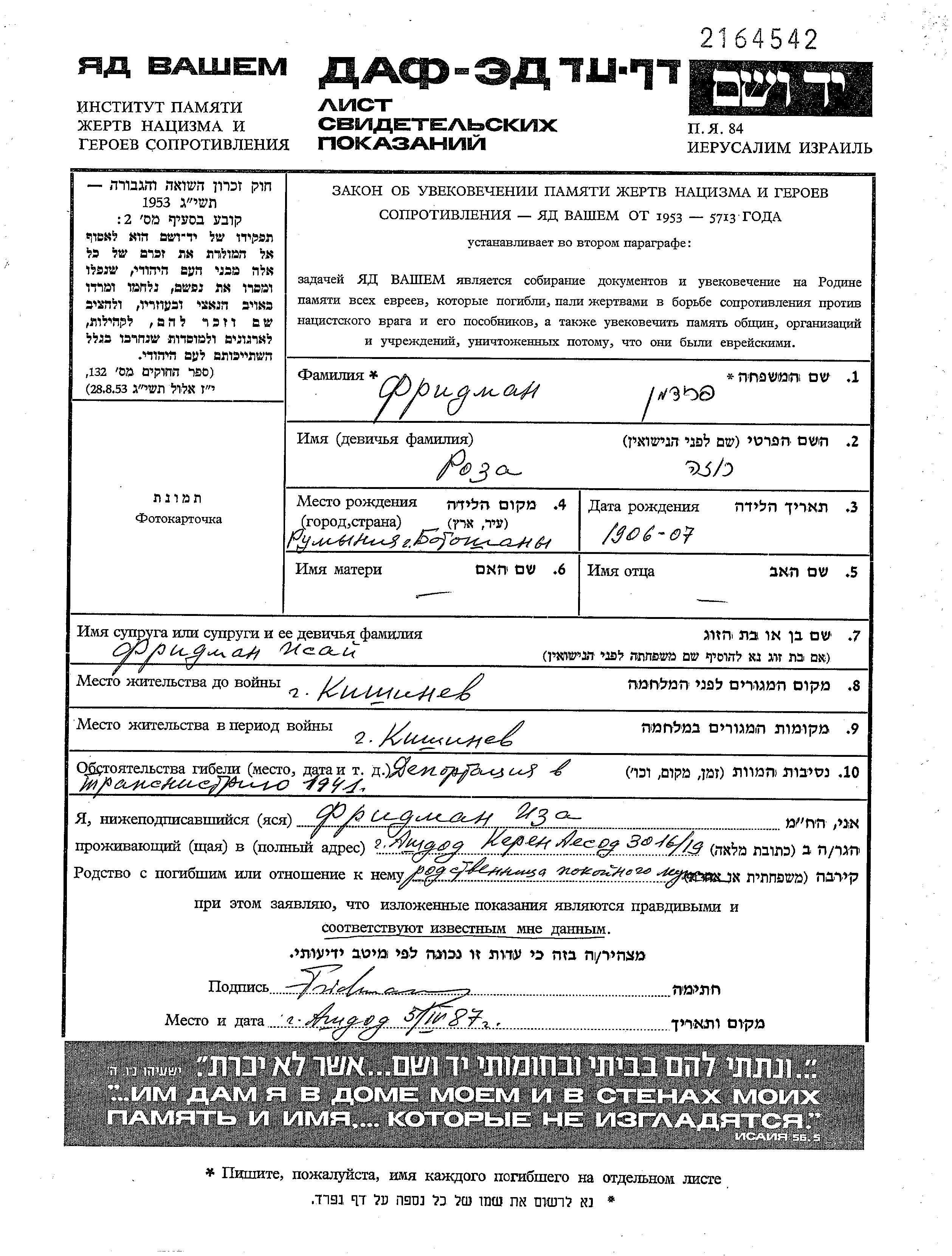Roza Fridman wurde im Jahr 1906 in Botosani, Rumänien geboren. Sie war mit Isai Verheiratet. Vor dem Zweiten Weltkrieg lebte sie in Kishinev, Rumänien. Während des Krieges war sie in Kishinev, Rumänien.