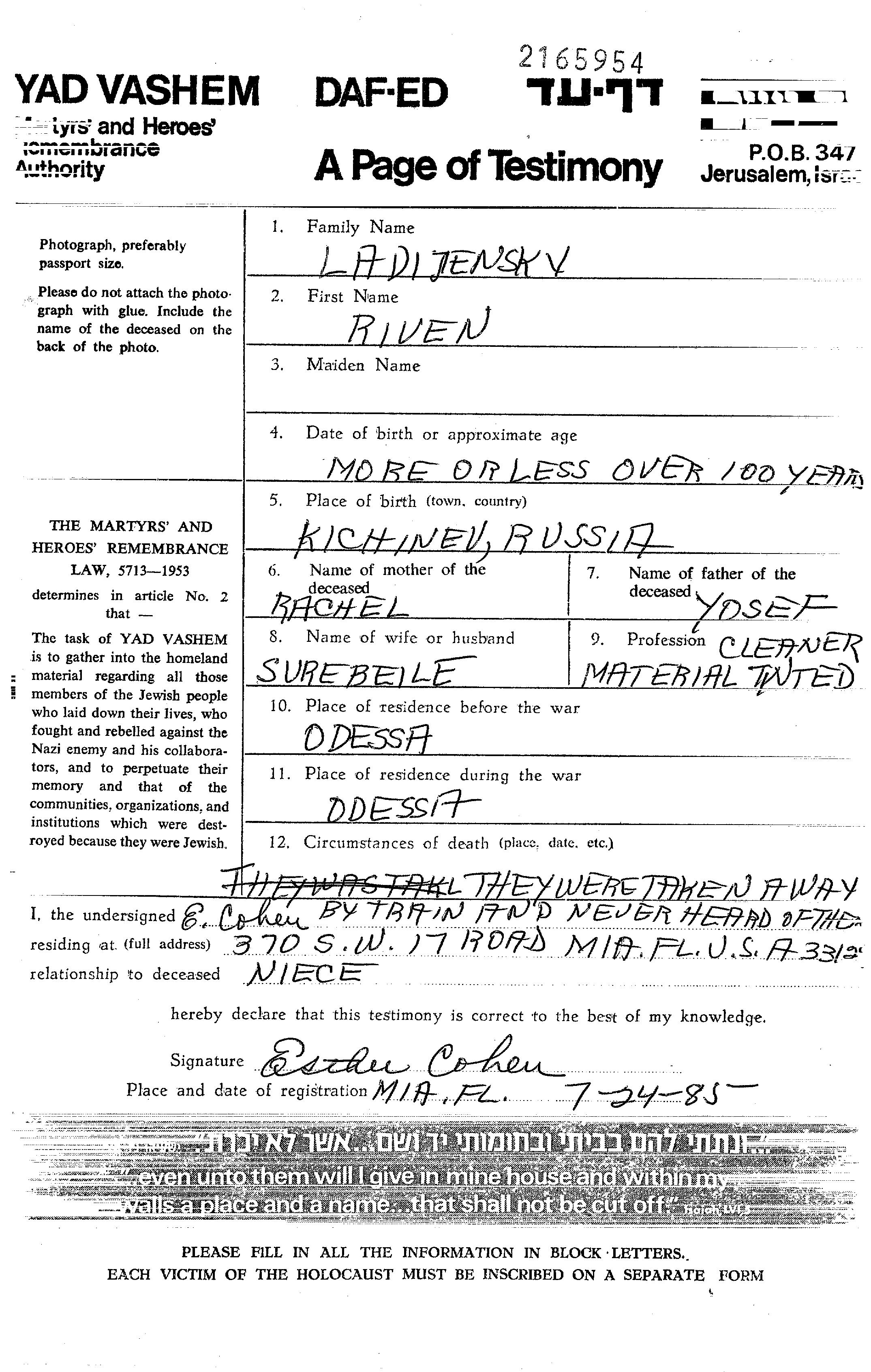 Reuven Ladijensky wurde im Jahr 1885 in Kishinev, Rumänien geboren. Er war der Sohn von Yosef und Rachel. Er war Arbeiter/-in und mit Sure Beile Verheiratet. Vor dem Zweiten Weltkrieg lebte er in Odessa, Ukraine (UdSSR). Während des Krieges war er in Odessa, Ukraine (UdSSR).