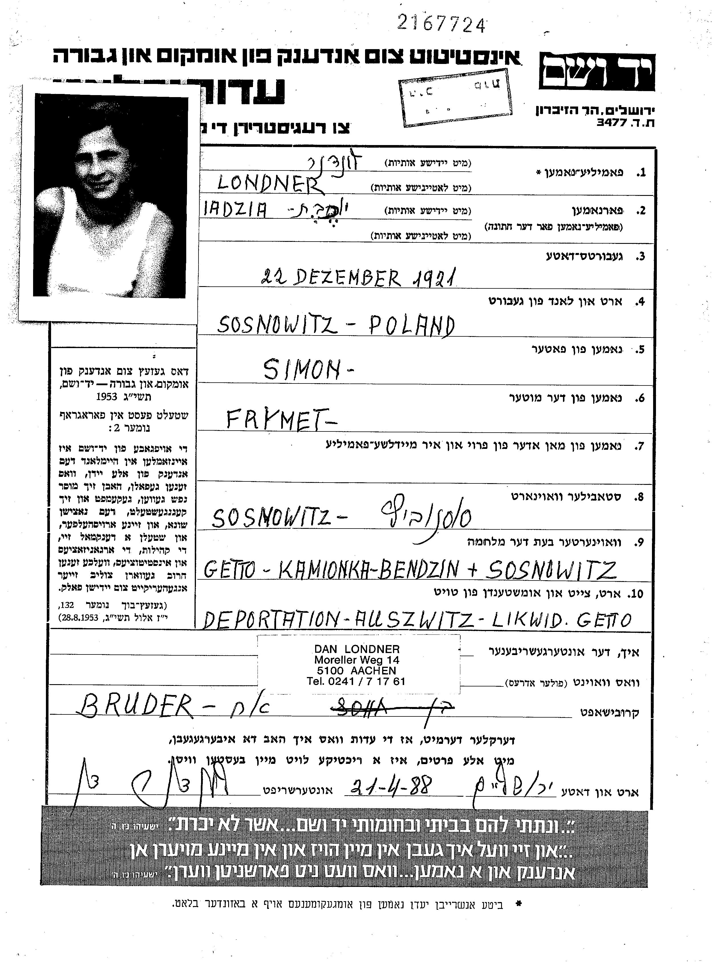 Yokhevet Adzia Londner wurde im Jahr 1921 in Sosnowiec, Polen geboren. Sie war die Tochter von Simon und Frymet Frania, geb. Wiener Veiner. Vor dem Zweiten Weltkrieg lebte sie in Sosnowiec, Polen. Während des Krieges war sie in Będzin, Polen.