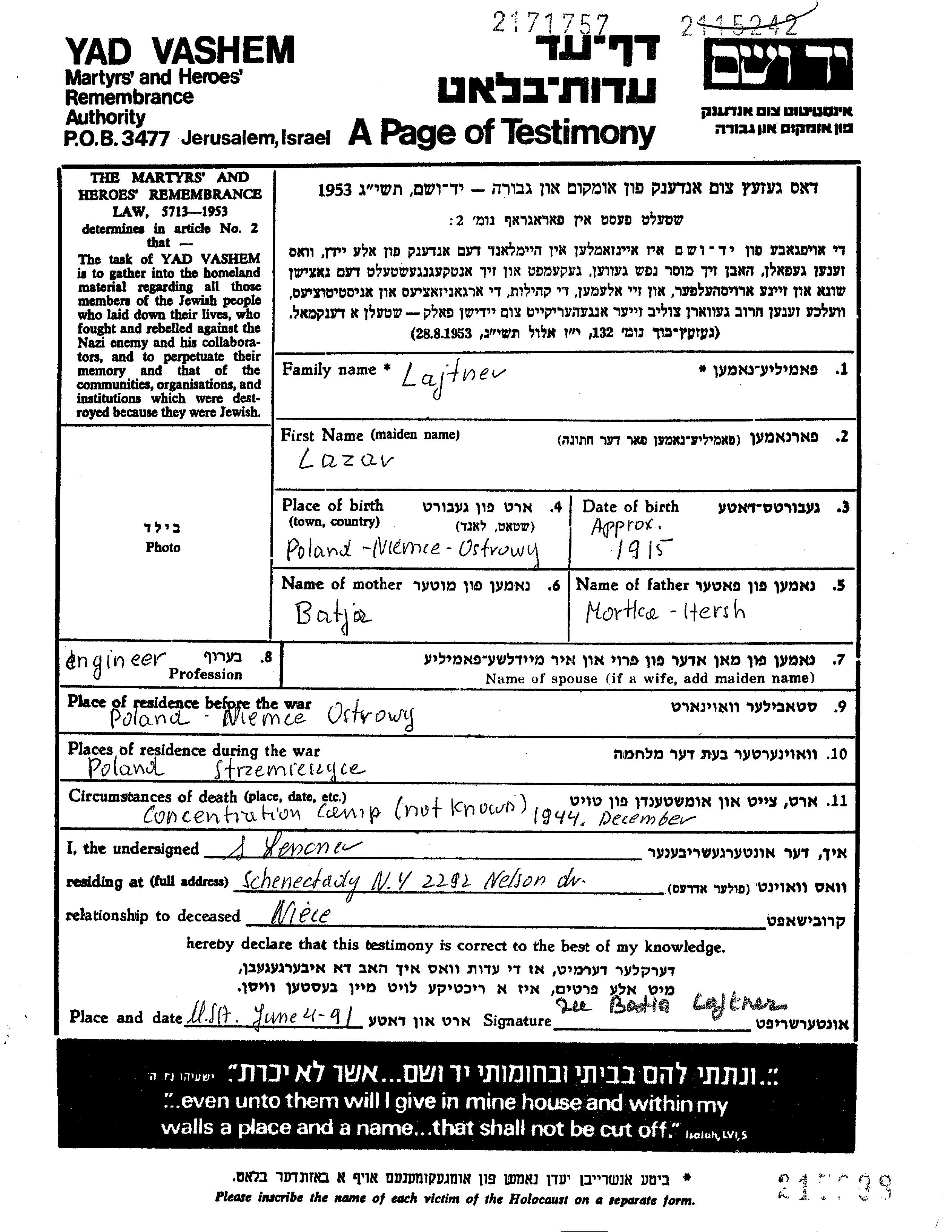 Lazar Lajtner wurde im Jahr 1915 in Niemce, Polen geboren. Er war der Sohn von Mortka Hersh und Batja, geb. Najer. Er war Ingenieur. Vor dem Zweiten Weltkrieg lebte er in Niemce, Polen. Während des Krieges war er in Strzemieszyce, Polen.