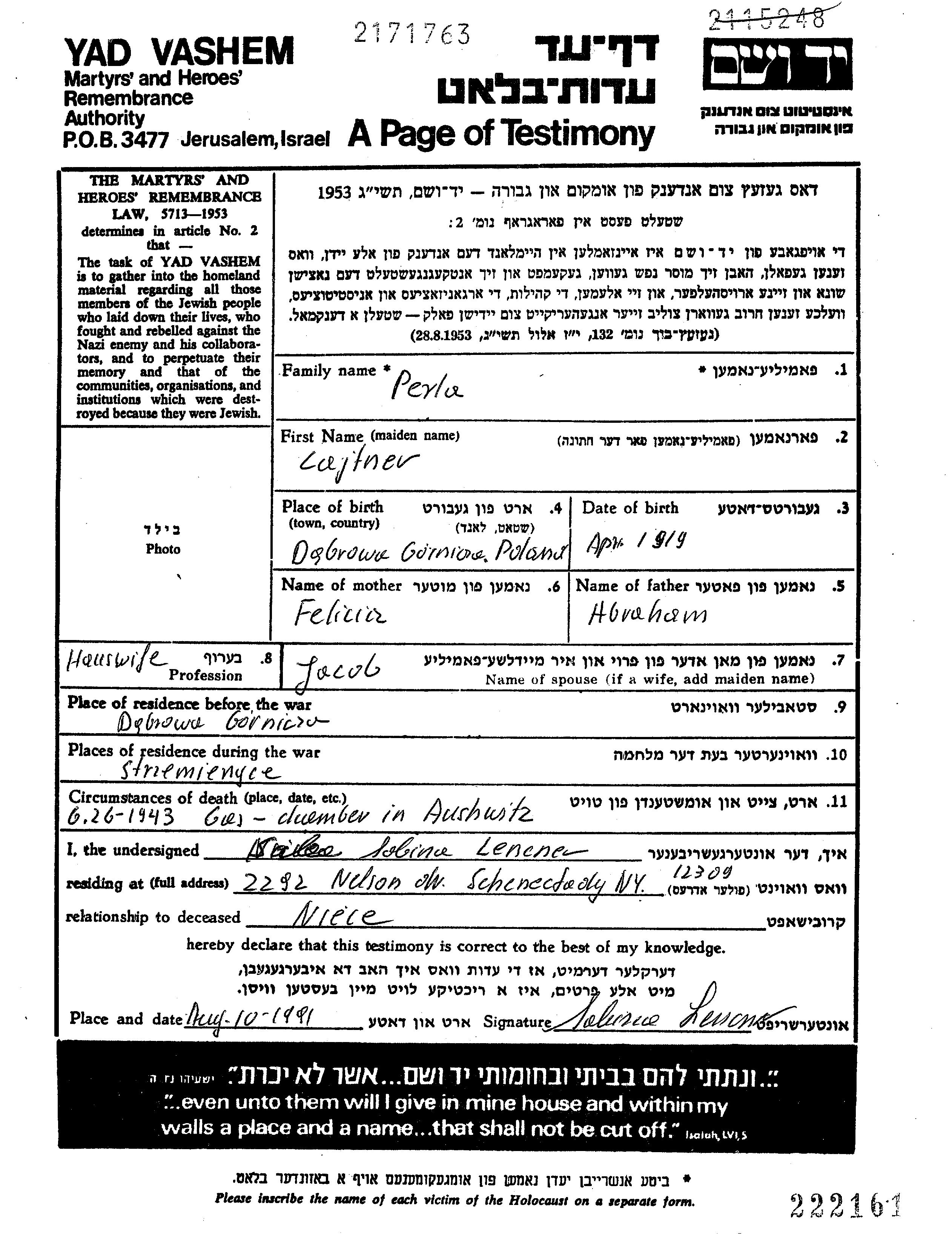 Perla Lajtner wurde im Jahr 1919 in Dabrowa Gornicza, Polen geboren. Sie war die Tochter von Abraham und Felicia. Sie war Hausfrau und mit Jacob Verheiratet. Vor dem Zweiten Weltkrieg lebte sie in Dabrowa Gornicza, Polen. Während des Krieges war sie in Strzemieszyce, Polen.