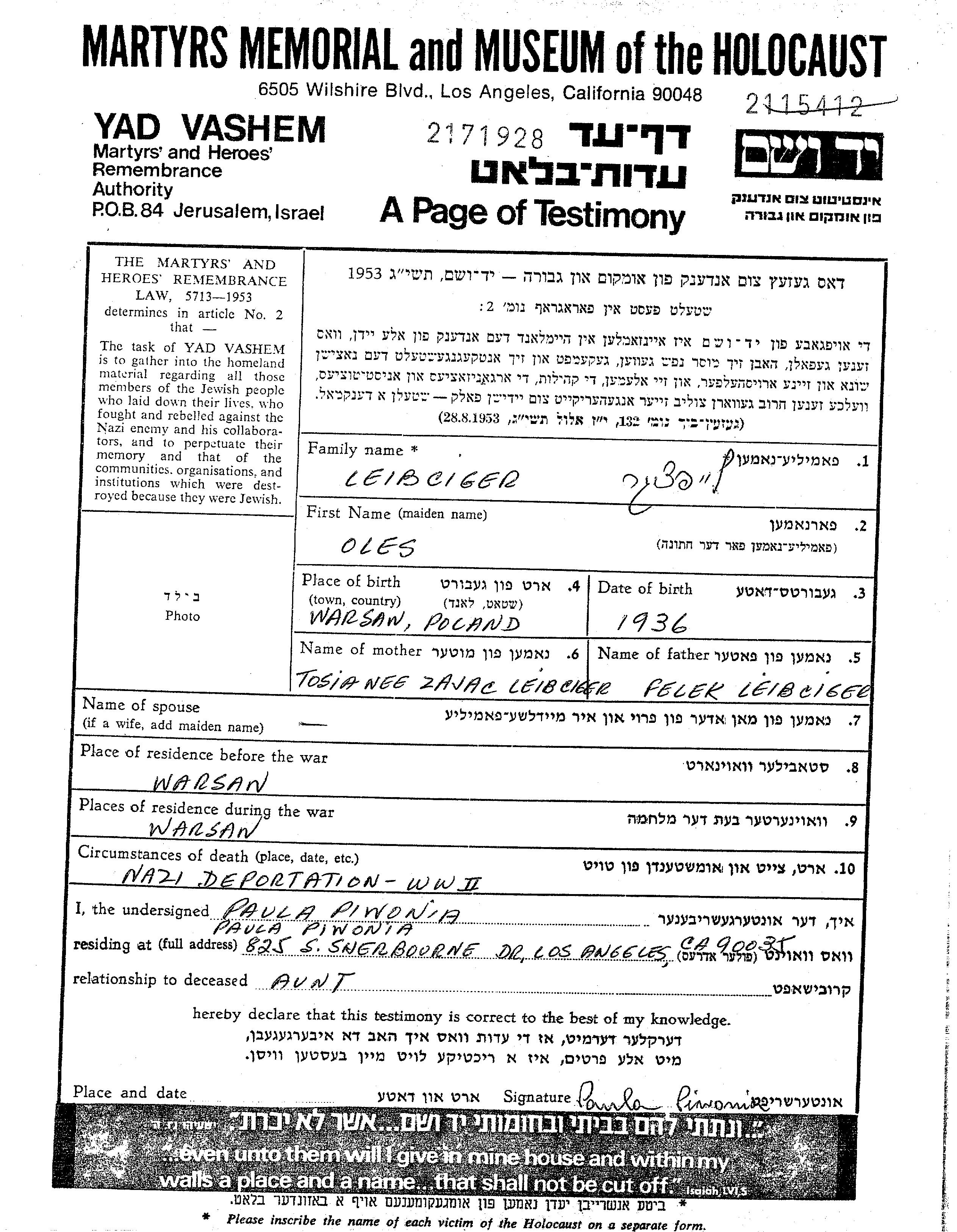 Oles Leibciger wurde im Jahr 1936 in Warszawa, Polen geboren. Er war der Sohn von Felek und Tosia, geb. Zajac Zaiatz. Er war Kind. Vor dem Zweiten Weltkrieg lebte er in Warszawa, Polen. Während des Krieges war er in Warszawa, Polen.