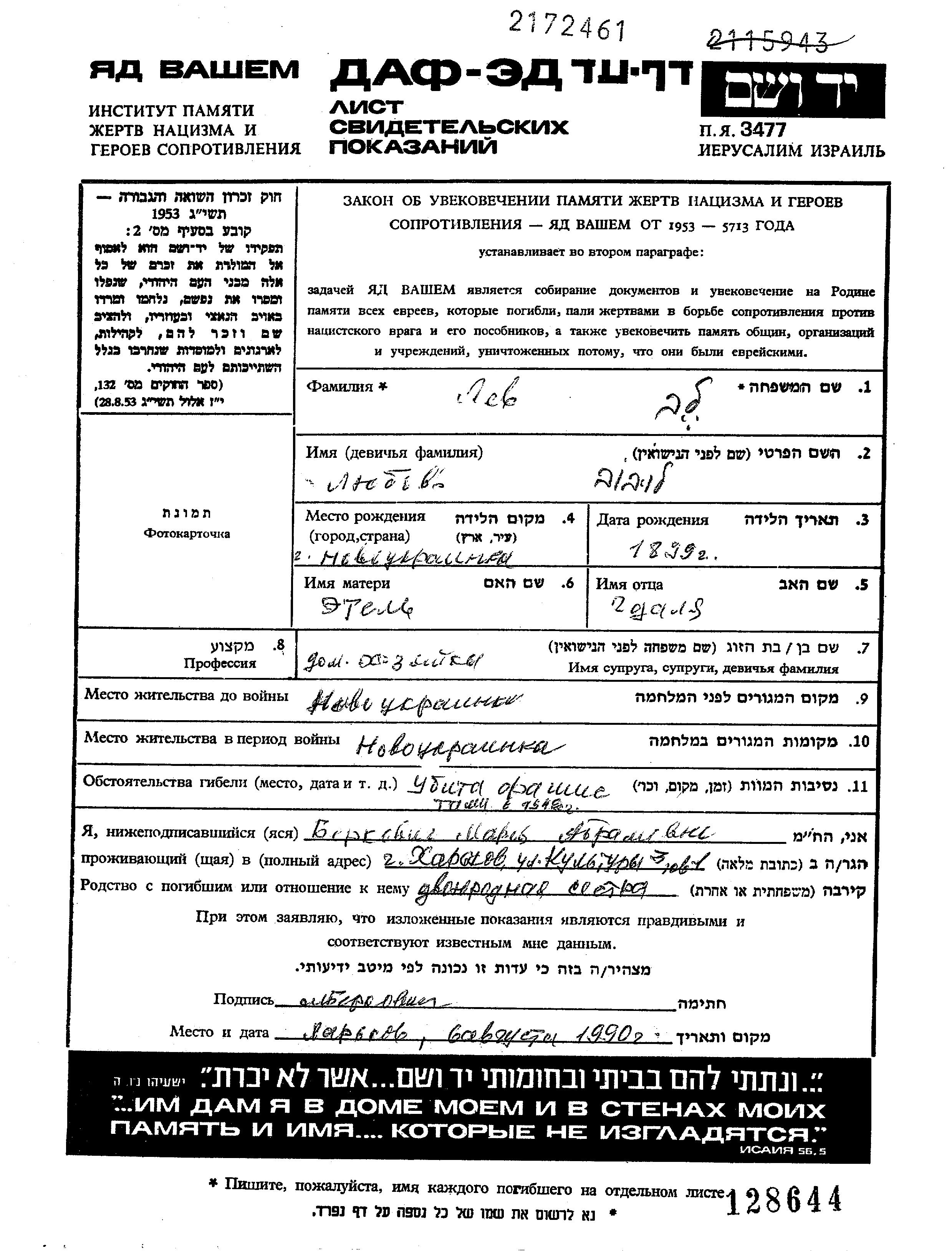 Lyubov Lev wurde im Jahr 1899 in Novo Ukrainka, Ukraine (UdSSR) geboren. Sie war die Tochter von Gdalia und Etel. Sie war Hausfrau. Vor dem Zweiten Weltkrieg lebte sie in Novo Ukrainka, Ukraine (UdSSR). Während des Krieges war sie in Novo Ukrainka, Ukraine (UdSSR).